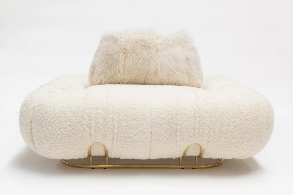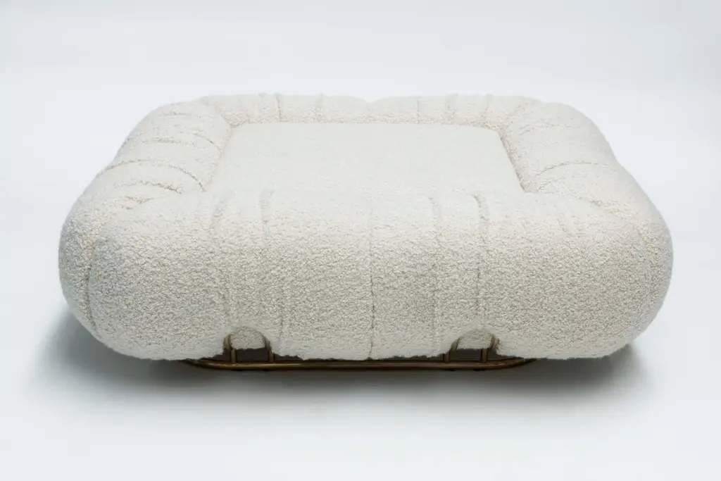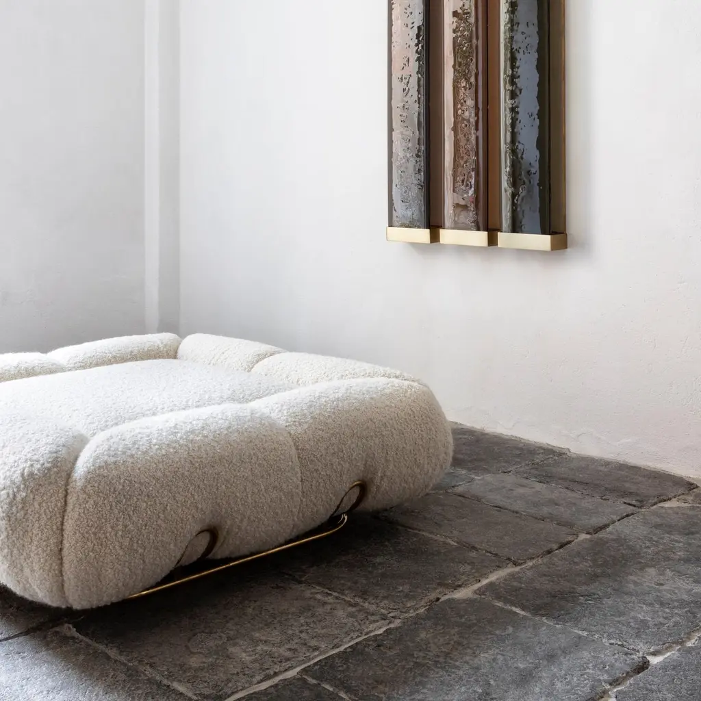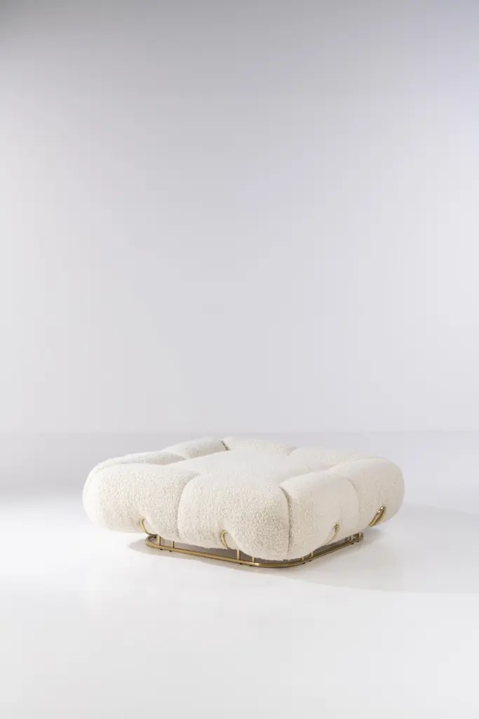 Unique pouf marshmallow by Draga & AurelDimensions: W 120 D 120 H 38Materials: Wool Deliciously soft and fluffy. This is the design of Marshmallow pouf, whose soft shapes live up to its name. It stands out for its polished brass structure which matches the velvet and soft wool upholstery. Founded in 2007 in the town of Como, Italy, Draga & Aurel is a multidisciplinary design studio that works along the spectrum of furniture, textile and interior design. Draga Obradovic began her career in the fashion industry, first working in London and Milan as a textile designer before eventuallysettling in Como. Aurel K. Basedow graduated from Milan’s Accademia di Belle Arti with a degree in Fine Arts, having previously trained as a carpenter and woodworker. Thanks to their sympathetic methods, combined with an artist’s approach to material and composition Draga & Aurel are widelyrecognized for their clever reinvention of bespoke vintage design pieces.Their showing at 2009’s Salone del Mobile introduced the duo to the world stage; it followed the partnerships with several companies that have pushed the pair’s domain beyond the reinvention of singular vintage pieces. While interior projects have expanded their sought after aesthetic into the realm of hospitality and lifestyle. In occasion of the 2019 Milan Design Week the design duo presented Transparency Matters, an exhibition of limited edition pieces, entirely fabricated by hand in their Como atelier.