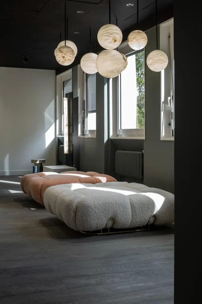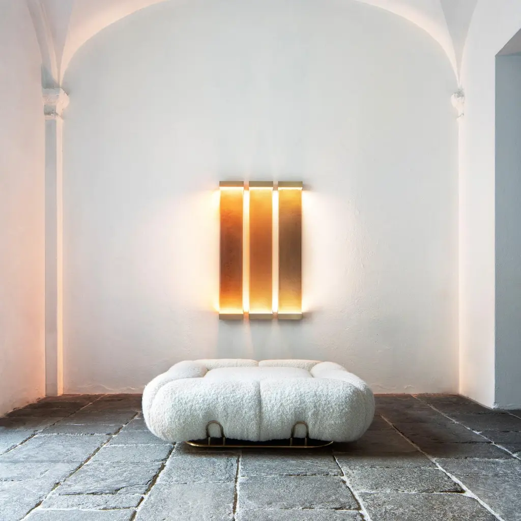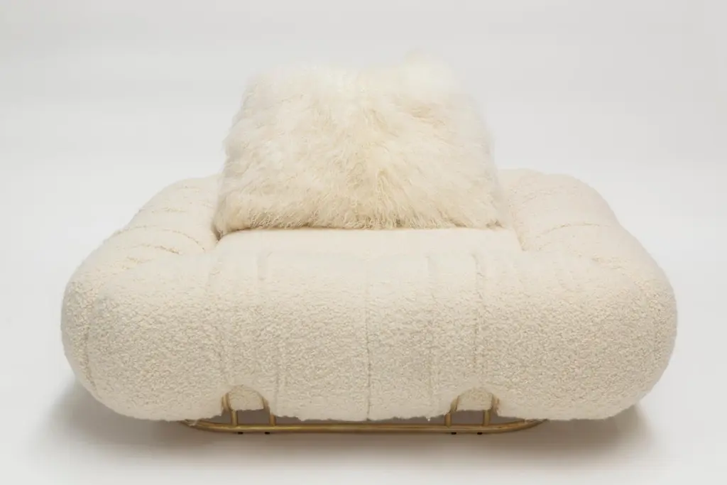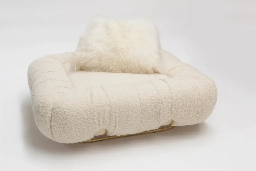 Unique pouf marshmallow by Draga & AurelDimensions: W 120 D 120 H 38Materials: Wool Deliciously soft and fluffy. This is the design of Marshmallow pouf, whose soft shapes live up to its name. It stands out for its polished brass structure which matches the velvet and soft wool upholstery. Founded in 2007 in the town of Como, Italy, Draga & Aurel is a multidisciplinary design studio that works along the spectrum of furniture, textile and interior design. Draga Obradovic began her career in the fashion industry, first working in London and Milan as a textile designer before eventuallysettling in Como. Aurel K. Basedow graduated from Milan’s Accademia di Belle Arti with a degree in Fine Arts, having previously trained as a carpenter and woodworker. Thanks to their sympathetic methods, combined with an artist’s approach to material and composition Draga & Aurel are widelyrecognized for their clever reinvention of bespoke vintage design pieces.Their showing at 2009’s Salone del Mobile introduced the duo to the world stage; it followed the partnerships with several companies that have pushed the pair’s domain beyond the reinvention of singular vintage pieces. While interior projects have expanded their sought after aesthetic into the realm of hospitality and lifestyle. In occasion of the 2019 Milan Design Week the design duo presented Transparency Matters, an exhibition of limited edition pieces, entirely fabricated by hand in their Como atelier.