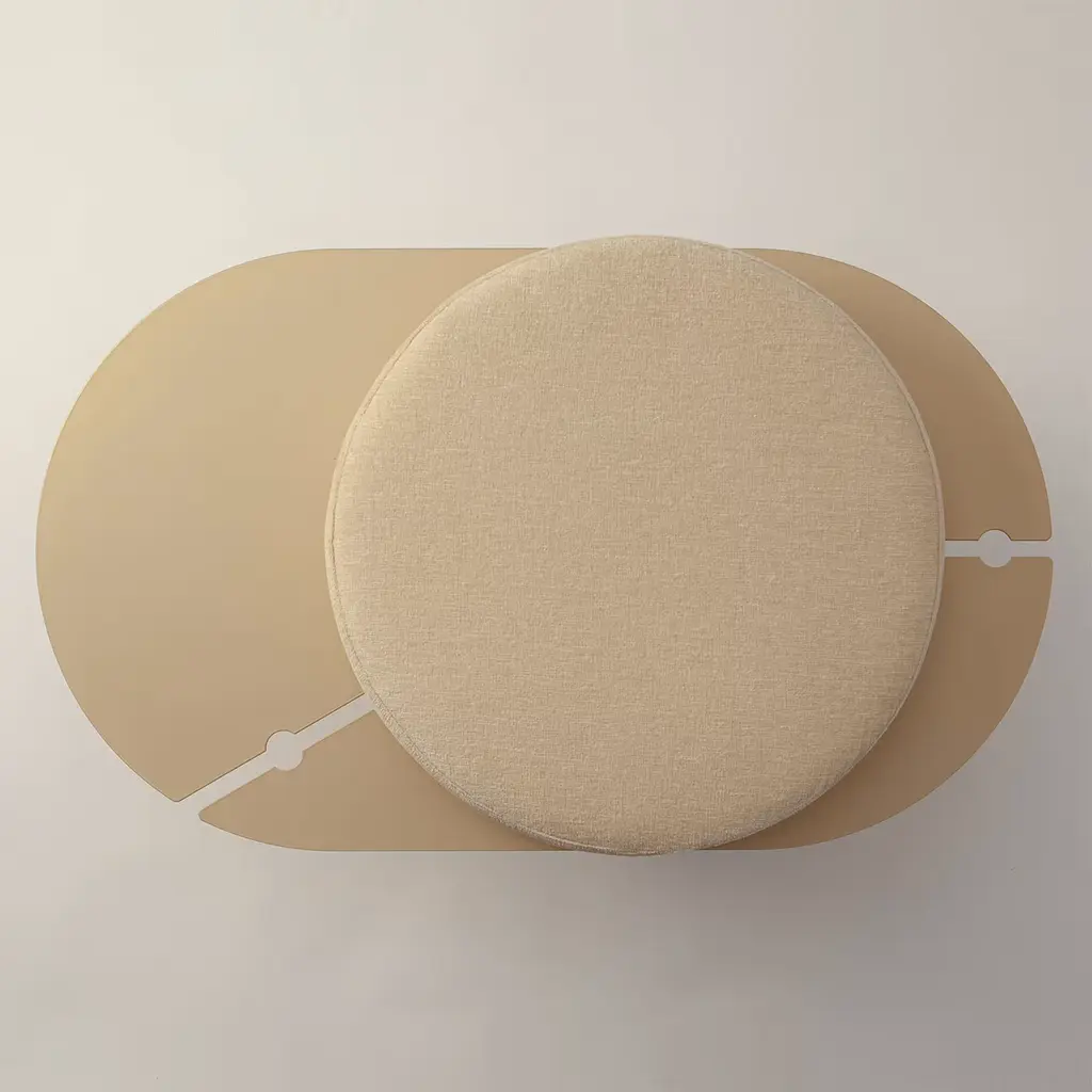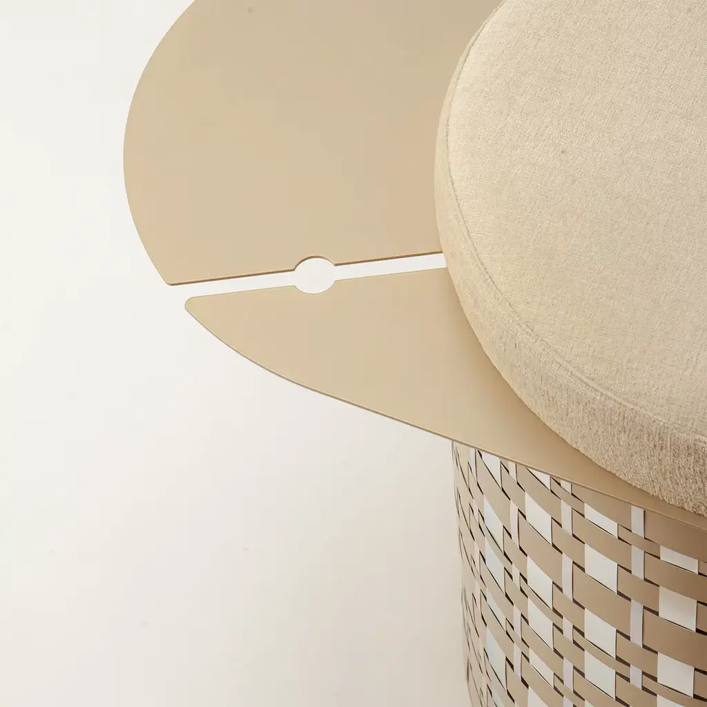 An exercise in versatility and elegance, this pouf boasts an elegant and dynamic silhouette that consists of a special weft made of SPLOT® - high-grade aluminum foil - crafted by hand and here enchanting with a combination of champagne and silvery hues. Interposed between the upholstered seat and the structure, a shaped plate features fissures where to quickly fit stem glasses during a party or aperitif.