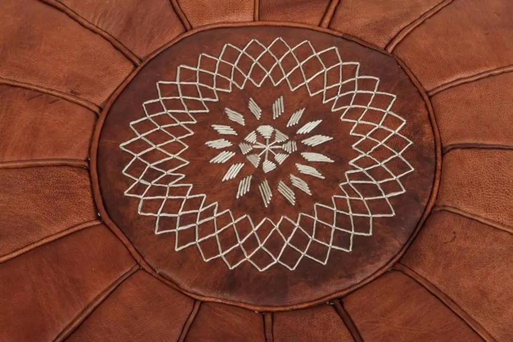 Pair of large vintage round Moroccan leather poufs, handcrafted in camel leather. Hand tooled and embroidered on the top with the Moorish star by Moroccan artisans in Marrakech. Nice patina. $1250 each.