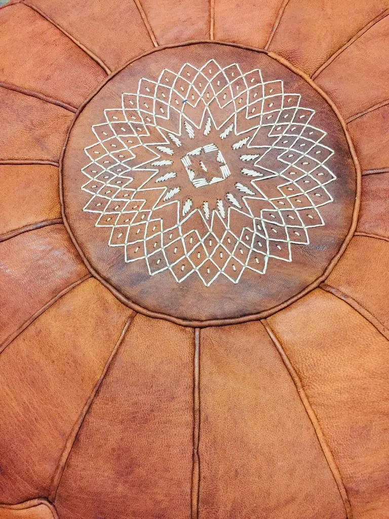 Large vintage round Moroccan leather pouf, handcrafted in brown camel leather. Hand tooled and embroidered on the top with the Moorish star by Moroccan artisans in Marrakech. Multiple available please contact us if you need more. $1250 each.