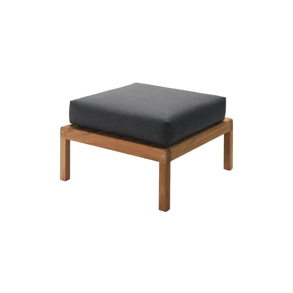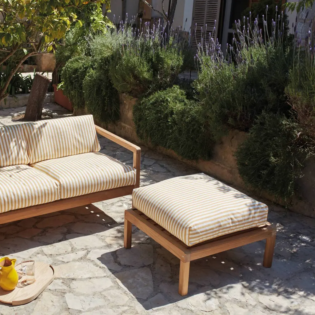 For use as a footstool or extra seating, this piece extends the unabashedly spare design ethos of Scandinavian duo Says Who. Virkelyst Pouf brings a fresh minimalist style to outdoor living. A spare wooden frame fashioned in solid teak plays off the squarely shaped deep cushion upholstered in Skagerak’s proprietary weather- and water-resistant textile Barriere.