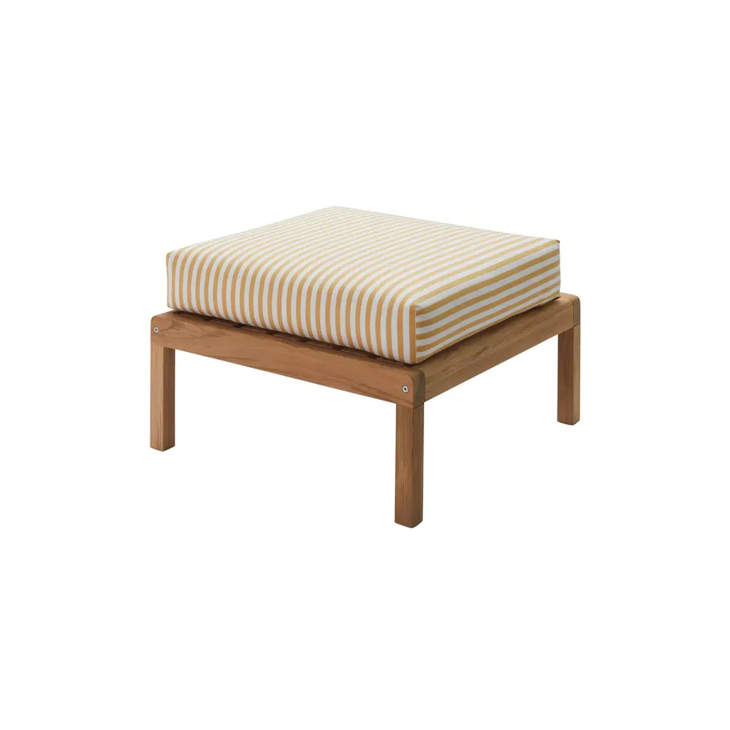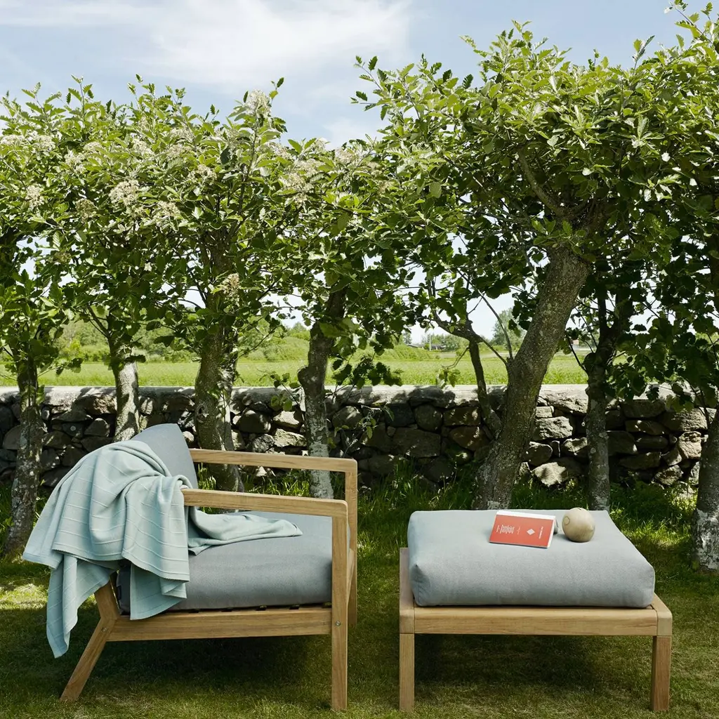 For use as a footstool or extra seating, this piece extends the unabashedly spare design ethos of Scandinavian duo Says Who. Virkelyst Pouf brings a fresh minimalist style to outdoor living. A spare wooden frame fashioned in solid teak plays off the squarely shaped deep cushion upholstered in Skagerak’s proprietary weather- and water-resistant textile Barriere.
