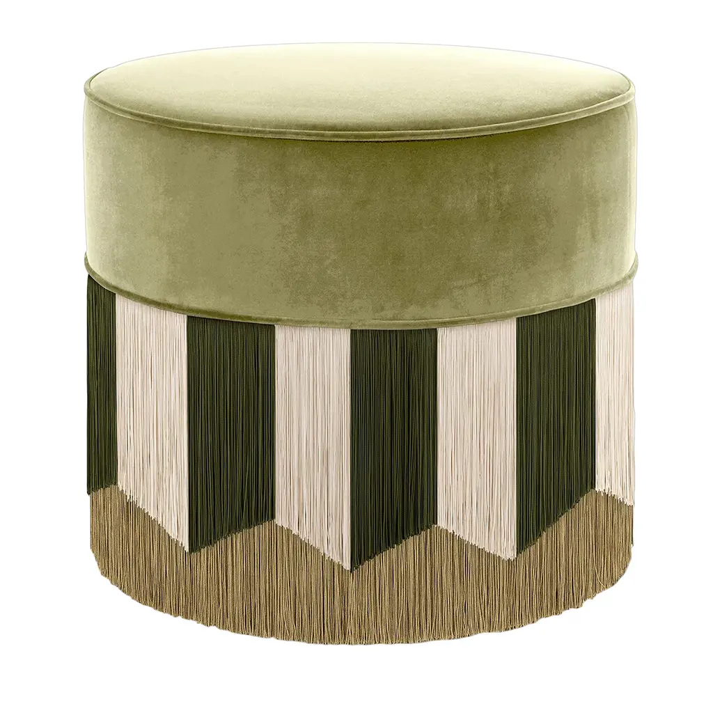 Bright and sunny, this pouf from the Couture Geometric Collection features yellow velvet 100% trevira and sea foam viscose fringe, lending it a colorful and cozy appeal. Perfect for drink trays or casual seating, the pouf sits on a painted beechwood base, guaranteeing stability. The pouf comes from a large collection of styles in different colors and shapes. Each bespoke piece is stamped on the bottom of the pouf’s lining and personally signed, numbered, and dated by designer.