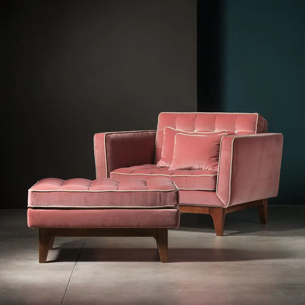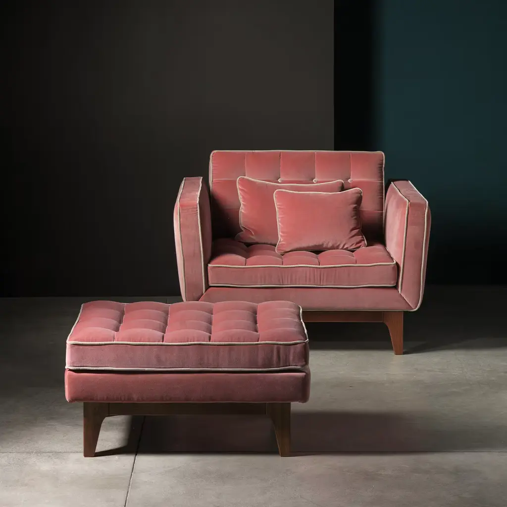 The Yvan Pouffe pairs a mid-century-style solid mahogany base with rich red velvet upholstery. Contrast piping and button-tufted quilting nod to traditional interior style codes, exuding a romantic allure to create a warm ambiance. Comfortable, stylish and versatile, this pouffe offers the perfect spot for your feet after a long day at work.