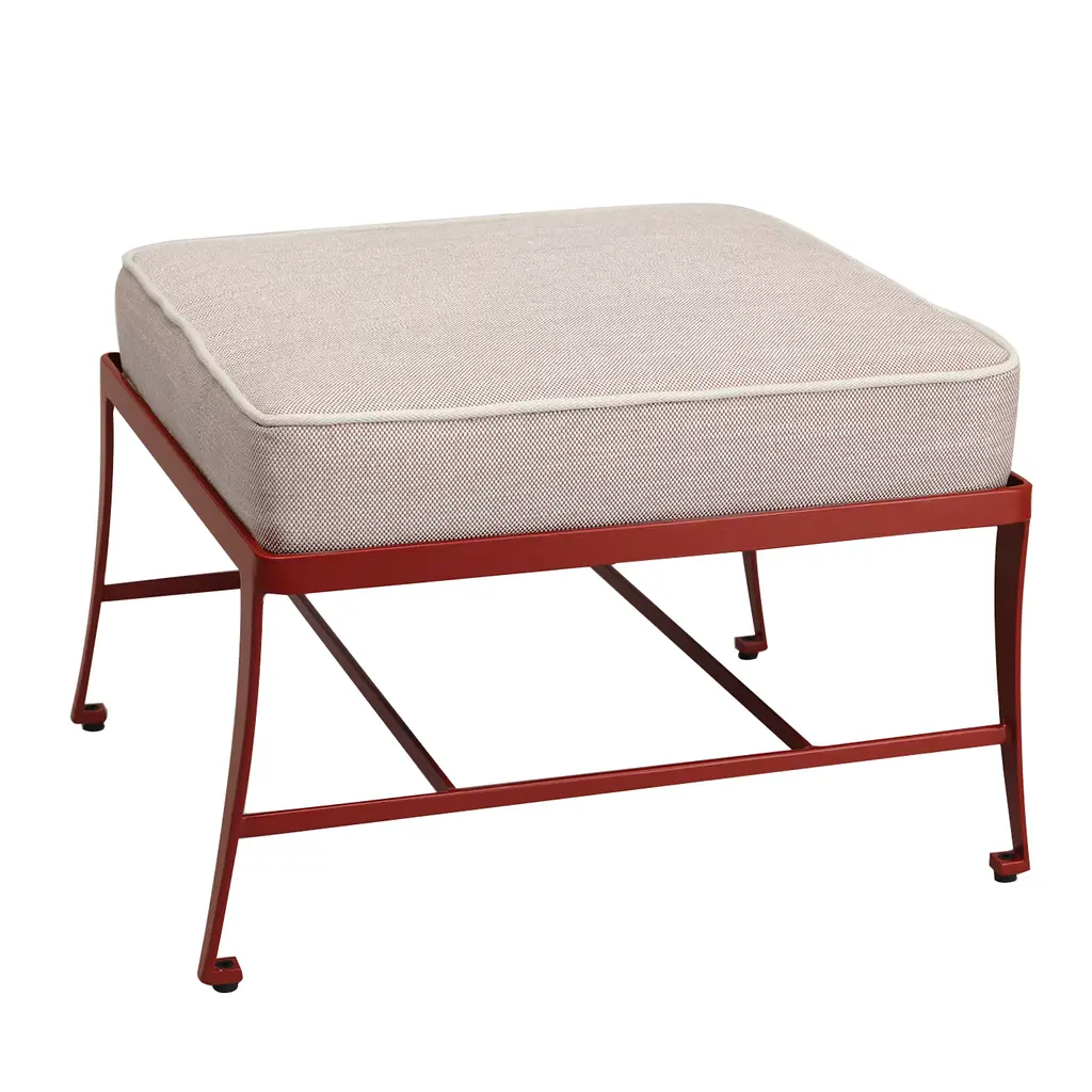 This elegant galvanized, powder-coated, stainless steel pouf features a red fabric cushion that is suitable for outdoor use. It decorative rod base creates a handy storage shelf. This piece represents a union between traditional Florentine craftsmanship and the quest for high-end contemporary design.