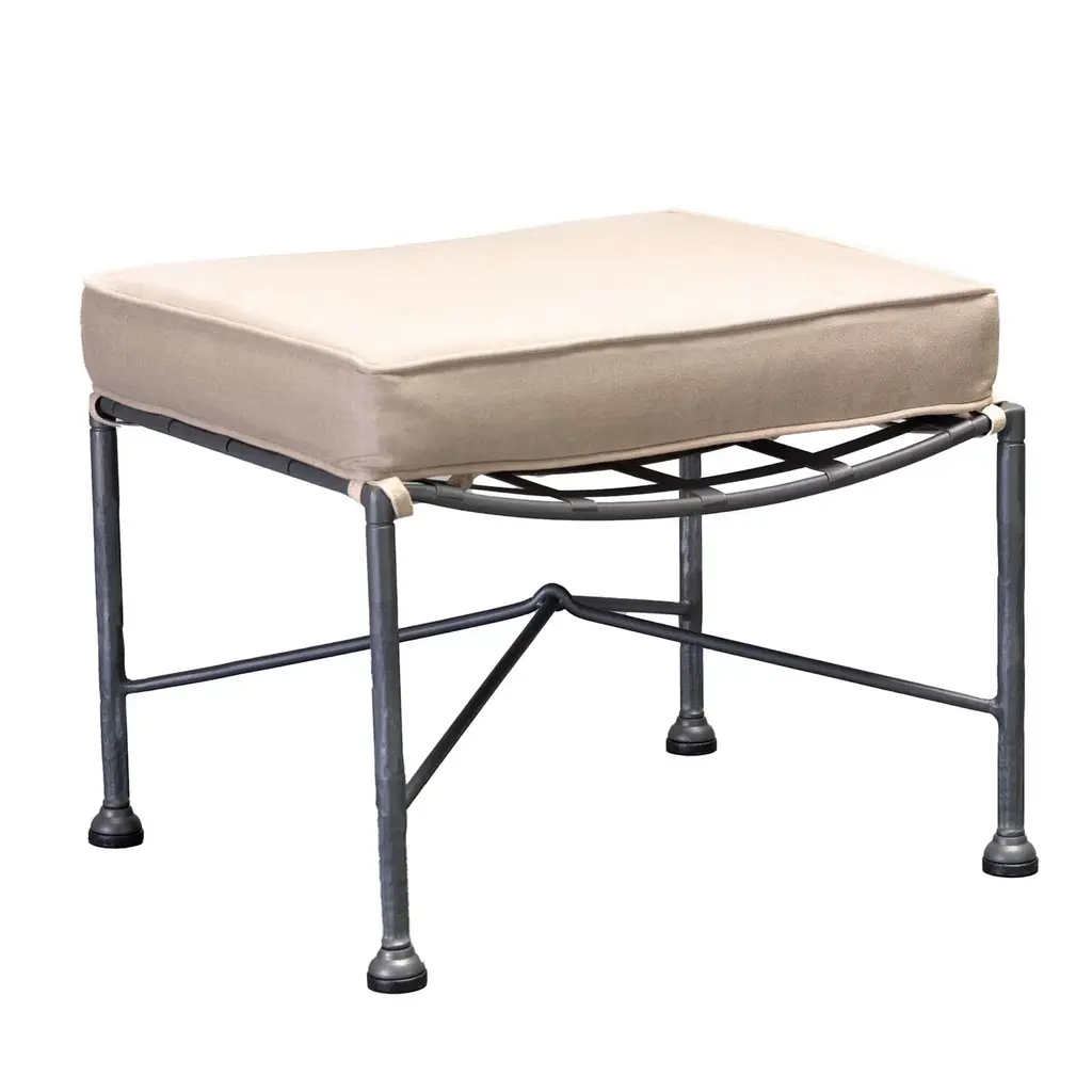 This elegant galvanized, powder-coated, wrought-stainless steel pouf features a red fabric cushion that is suitable for outdoor use. It decorative rod base creates a handy storage shelf. This piece represents a union between traditional Florentine craftsmanship and the quest for high-end contemporary design.