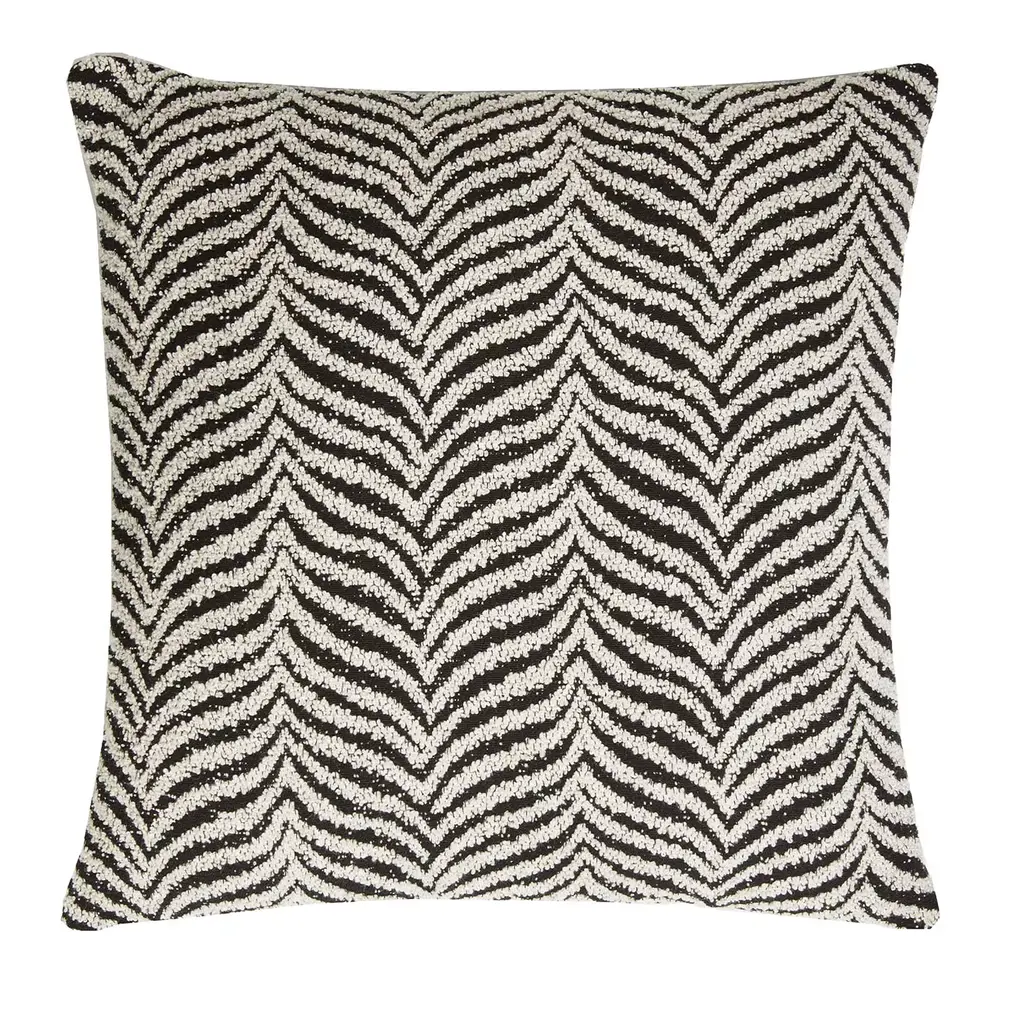 A cylindrical pouf, with a viscose blend jacquard faded velvet effect fabric. Decorated with a black and white zigzag pattern.