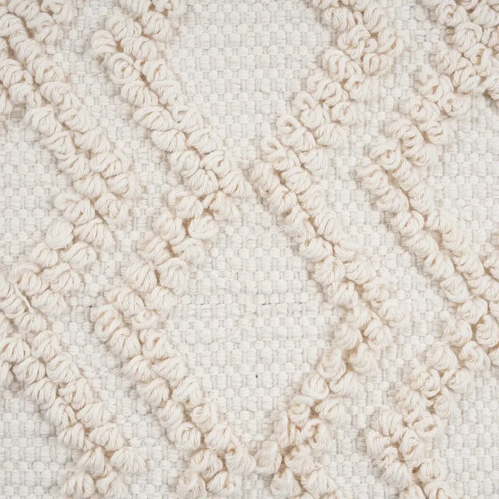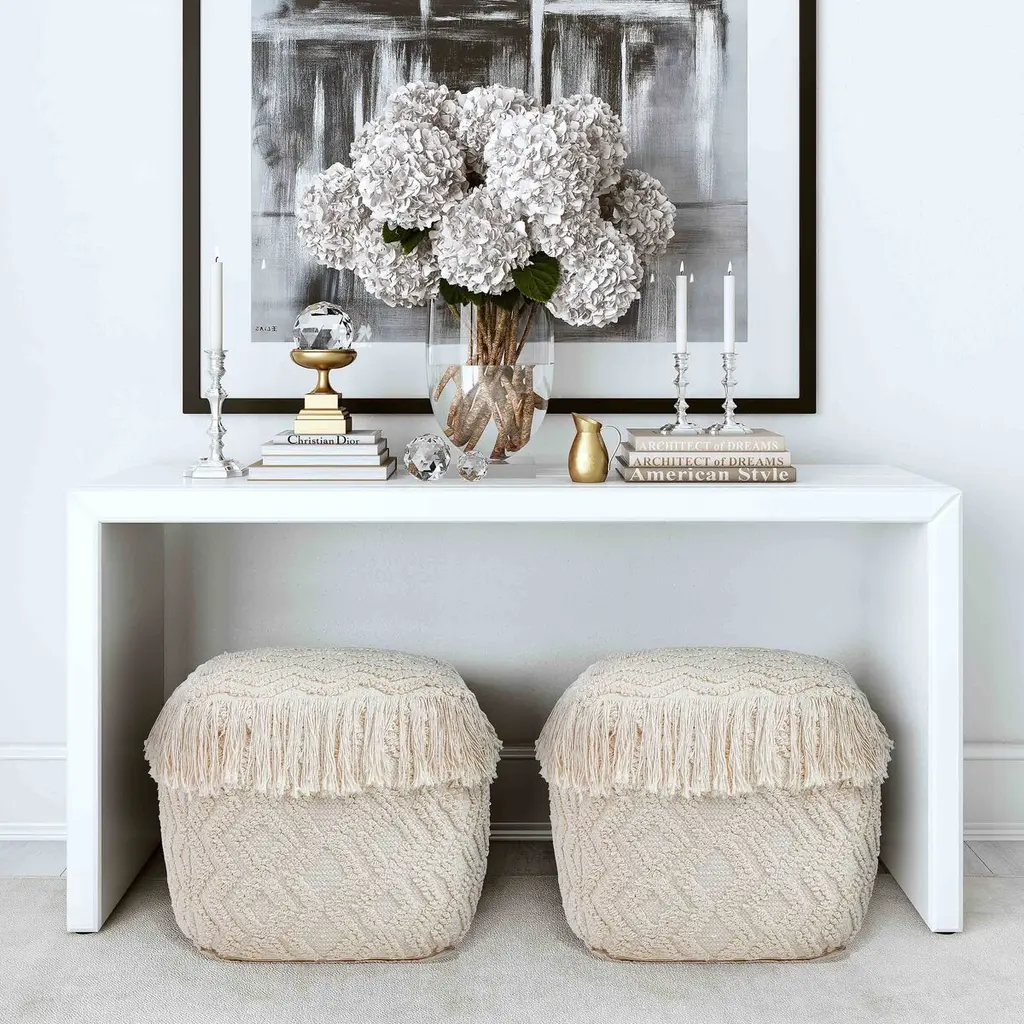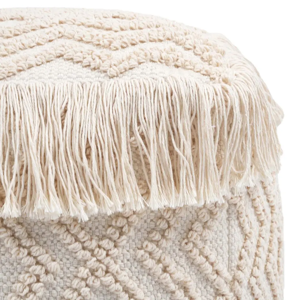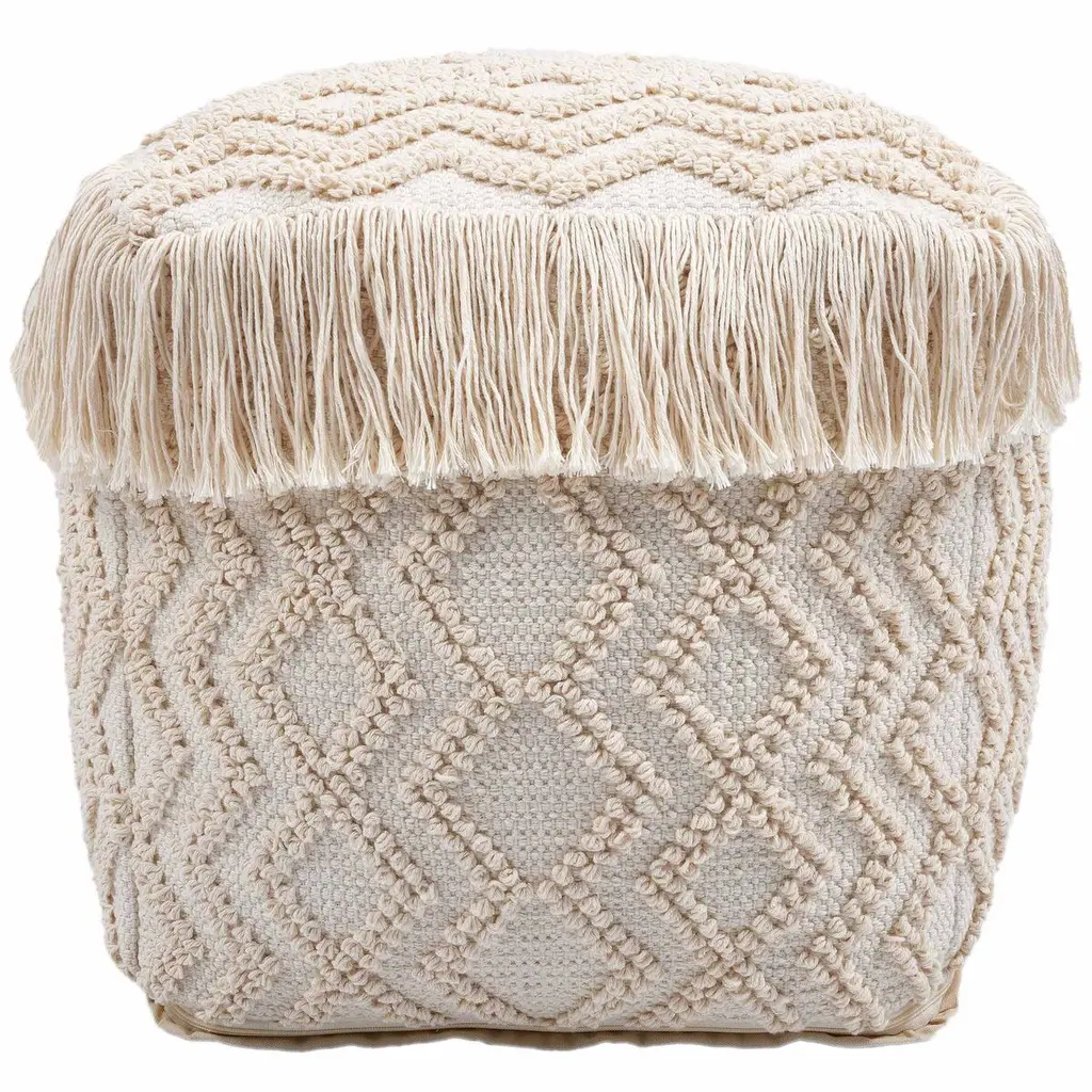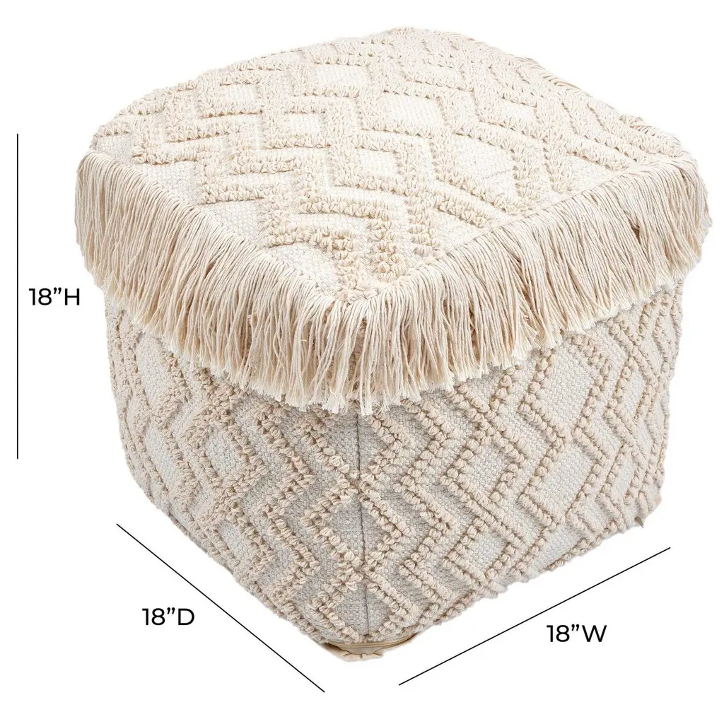 Fringe trim and textural cotton upholstery give an artisanal vibe to this pouf. Endlessly versatile, it can be used as a footrest, seat, or cocktail ottoman when topped with a tray.