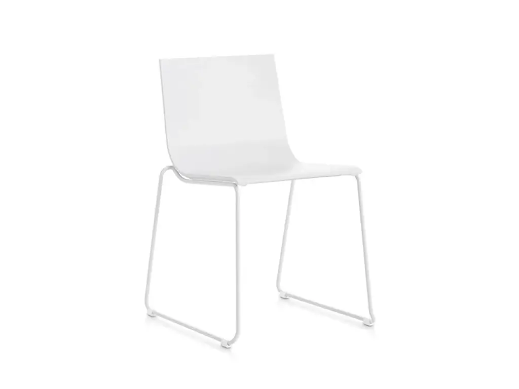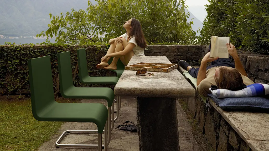 The aesthetic hallmark of the .05 chair is its sleek, reductive shape. The resilient seat shell, made of integral skin foam with embedded leaf springs, is combined with a cantilever base that flexes slightly when the sitter leans back to provide an unexpected level of comfort. The .05 chair is suited for outdoor use and is also available in a stacking version.