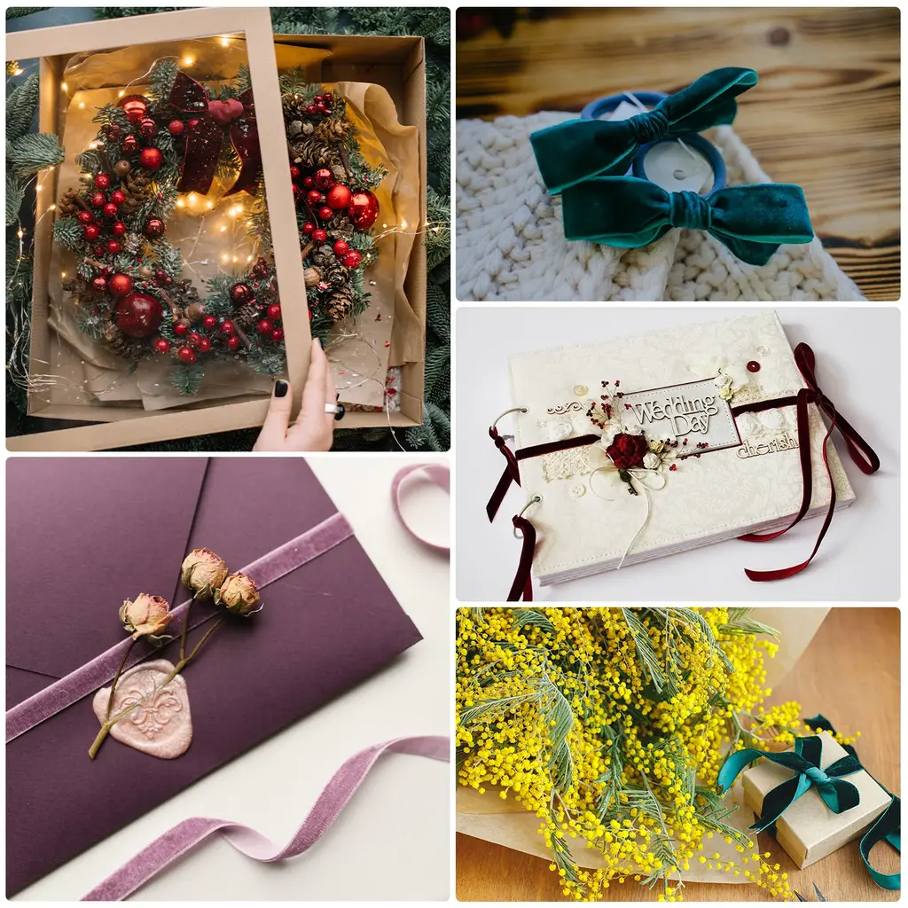 Velvet ribbons are widely used in weddings and birthday parties, graduation ceremonies, Easter, Halloween, home decoration, etc. It can be used as earring decoration, DIY hanging decoration, clothing decoration ribbon, braided headband, gift packaging, invitation and candy box bows, gift box gift wrapping, and clothing accessories decoration.Specification Color: BlackMaterial: NylonSize: 9.1m x 9mm / 10yards x 0.35inch(L*W)Package Contents: 1Pcs x Single Faced Velvet RibbonAdvantage1. Velvet Material: Velvet ribbon has luxurious pile and beautiful luster. It has a delicate hand feel, comfortable texture, good gloss, not easy to shed, fade, wrinkle, break or tear, single-sided fluffy design, thick fluff, and rebound quickly after being pressed by hand.2. DIY as you like: Vintage velvet is very suitable for DIY and crafts, you can add other accessories to make decorations and improve your hands-on ability.Instruction When cutting for use, determine the required quantity, cut it to avoid waste, and then decorate or fix it according to your needs.NOTE: Please allow slight deviations in color kindly due to different camera lenses, photography environments and display screens.