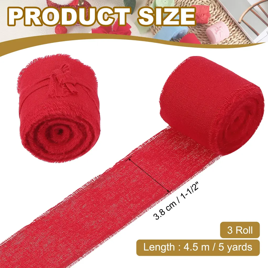 Handmade fringe cotton ribbons are used for gift wrapping, cards, wedding invitations, bridal shower bouquets, holiday party decorations, clothing decorations, DIY crafts, and home decorations, adding a touch of charm and elegance to various crafts, gifts, clothing, and DIY projects.SpecificationColor: RedMaterial: CottonWidth: 3.8 cm / 1-1/2 inchLength (Each Roll): 4.5 m / 5 yardsPacking List: 3 Roll x Handmade Fringe Cotton RibbonAdvantageThe ribbon is made of cotton material, soft to the touch, delicate, and lightweight, the handmade tassel design gives the ribbon a unique look, enhancing the visual appeal of your project.InstructionEasily cut the ribbon into any length you need with scissors.You can use glue, tape, or sew the frayed fringe cotton ribbon to decorate your items.NOTE:Due to the difference in natural light and display resolution, the item color displayed in photos may be slightly different from the real object.Please confirm that the product size meets your needs before placing an order.