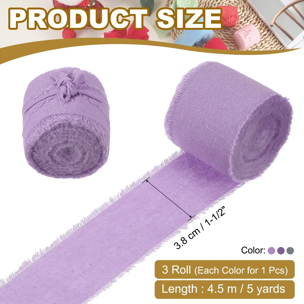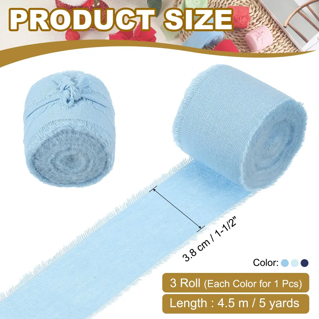 Handmade fringe cotton ribbons are used for gift wrapping, cards, wedding invitations, bridal shower bouquets, holiday party decorations, clothing decorations, DIY crafts, and home decorations, adding a touch of charm and elegance to various crafts, gifts, clothing, and DIY projects.SpecificationColor: Dust Blue, Sky Blue, Iron BlueMaterial: CottonWidth: 3.8 cm / 1-1/2 inchLength (Each Roll): 4.5 m / 5 yardsPacking List: 3 Roll x Handmade Fringe Cotton RibbonAdvantageThe ribbon is made of cotton material, soft to the touch, delicate, and lightweight, the handmade tassel design gives the ribbon a unique look, enhancing the visual appeal of your project.InstructionEasily cut the ribbon into any length you need with scissors.You can use glue, tape, or sew the frayed fringe cotton ribbon to decorate your items.NOTE:Due to the difference in natural light and display resolution, the item color displayed in photos may be slightly different from the real object.Please confirm that the product size meets your needs before placing an order.