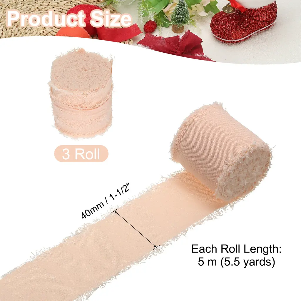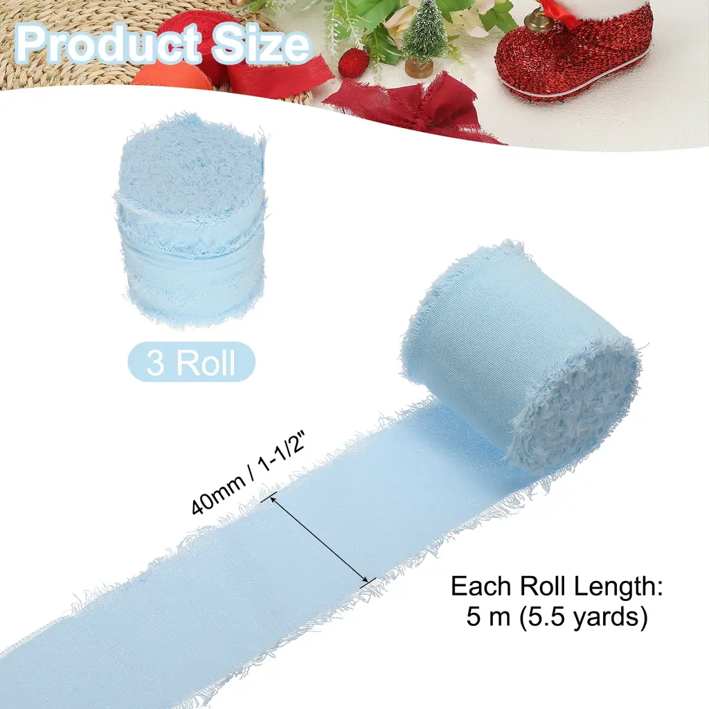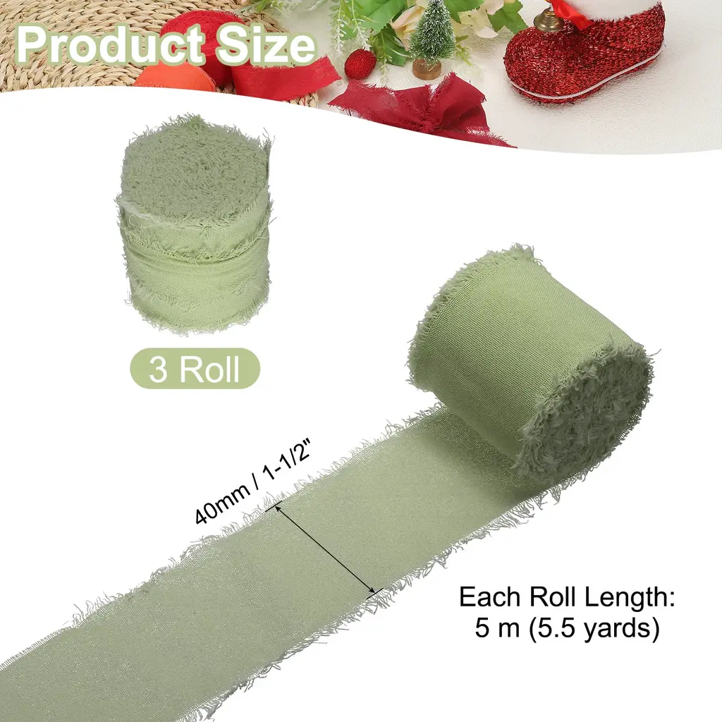Handmade fringe cotton ribbons are used for gift wrapping, cards, wedding invitations, bridal shower bouquets, holiday party decorations, clothing decorations, DIY crafts, and home decorations, adding a touch of charm and elegance to various crafts, gifts, clothing, and DIY projects.SpecificationColor: Light GreenMaterial: CottonWidth: 4 cm / 1-1/2 inchLength (Each Roll): 5 m / 5.5 yardsPacking List: 3 Roll x Handmade Fringe Cotton RibbonAdvantageThe ribbon is made of cotton material, soft to the touch, delicate, and lightweight, the handmade tassel design gives the ribbon a unique look, enhancing the visual appeal of your project.InstructionEasily cut the ribbon into any length you need with scissors.You can use glue, tape, or sew the frayed fringe cotton ribbon to decorate your items.NOTE:Due to the difference in natural light and display resolution, the item color displayed in photos may be slightly different from the real object.Please confirm that the product size meets your needs before placing an order.