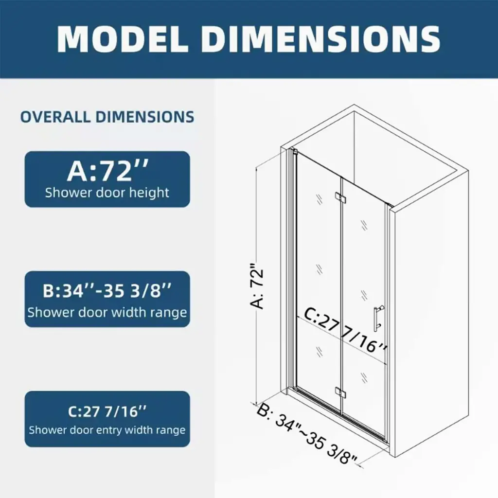 【Product Features】 ★Alu wall channel with quality #304 stainless steel handle, with 36000 times open and close test. ★The shower door has SGCC 1/4" tempered clear glass ★The shower door has smooth and comfortable pivot system ★The shower door has good anti-leakage function. ★The shower door has big adjustement, cover 34-35 3/8" 【This product is fragile, if there is any damage when you receive the goods, please take a photo and contact us, so that we can quickly verify and deal with you】 【Notes】 1.Size Notice:Manual measurement has been used, there may be some reasonable errort, thanks for your understanding. 2.Color Notice:Due to factors such as display equipment and shooting environment, the color of the item may be slightly different from the picture, which is a normal phenomenon, please refer to the actual item 3.Assembly Notice:Please read assemble manual in advance. Please do not over-tighten nuts, as this may cause distortion or breakage. 4.It is recommended to put a layer of foam or soft cushion on the floor when installing to avoid scratching the floor. 5.If the item has any defects, damage or missing parts, please contact us with pictures or videos so that we can understand your needs and help you quickly, and always remember to retain its original packaging to ensure any return requests. We will try our best to solve any problems you may have. 6.If you receive the wrong product, please attach the product picture, the infographic of the outer package and the picture containing SKUs, so that we can verify and quickly deal with it for you