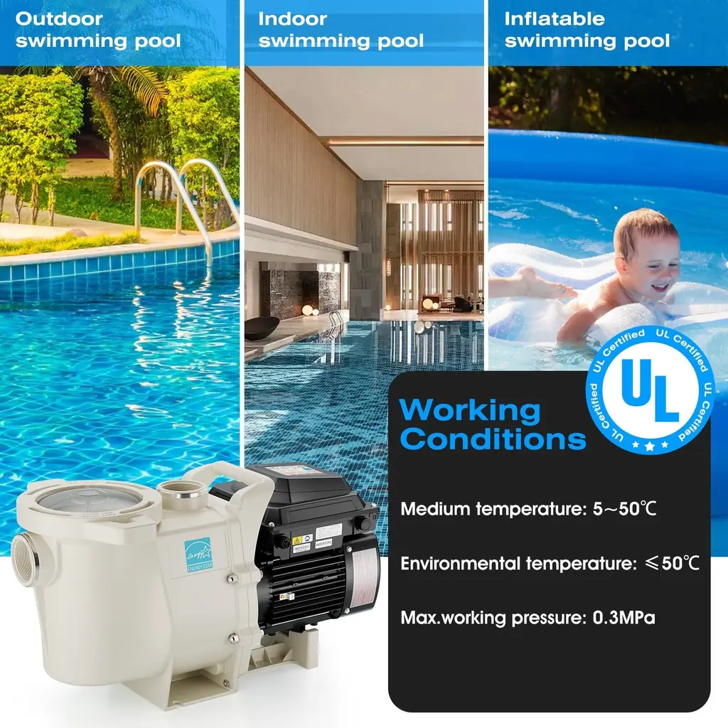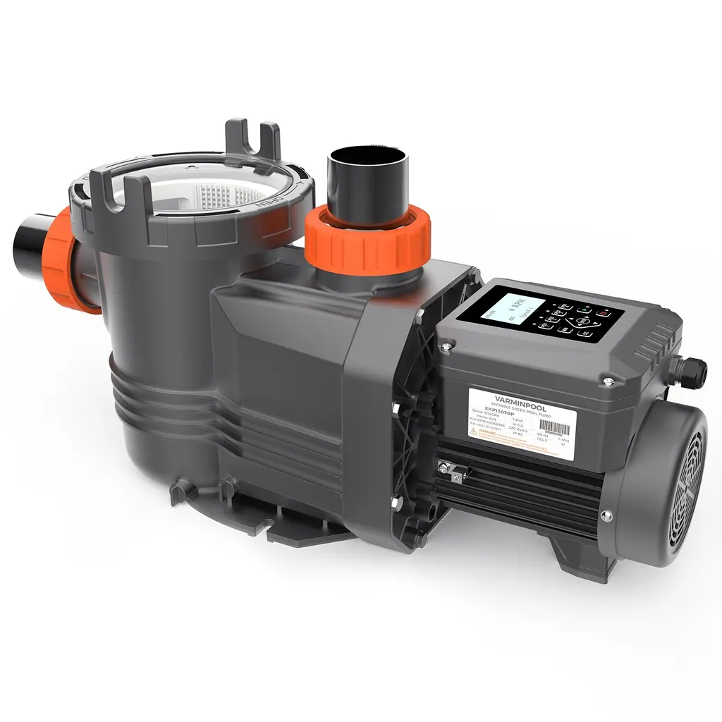 1.8 HP Variable Speed Pool Pump: Designed for both above and inground pools, this pump features a high-performance permanent magnetic motor and precision impeller, delivering a powerful flow rate of up to 9114 GPH while maximizing energy efficiency Step-less Variable Speed Control: Equipped with advanced inverter technology, the pump offers smooth speed control from 1200 to 4000 RPM. The four preset speed options make it adaptable for all pool convenient needs Centralized Control Unit: Seamlessly integrates with heating systems and filters, allowing customized scheduling and speed settings for optimal pool operation. Achieve ideal performance with reduced energy consumption Energy Saver: With smart control unit and invert technology, our pump is ideal for 24-hour operation to retain desire pool condition. By setting up proper operation schedules, it allows up to 80% energy cost reduction in respect to on/off design product Durable Construction: Built with weather-resistant, industrial-grade casing, this pump is ideal for outdoor use. Additional protective rain shell also featured, ensures continuous, reliable performance in various environments Reinforced Polymer Flow Chamber: Built from industrial polymers, the flow chamber offers superior resistance to complex compounds in the pool water. Suitable for all water types, including saltwater pools, ensuring long-lasting, reliable operation Pump Specification: Power: 1.8 HP / 1.3 KW. Maximum flow rate: 9114 GPH. Voltage: 220 V. Maximum head: 64 ft. Inlet / outlet hose size: 2.5 ''. Size parameter: L 27.2'' W 9.06'' H 13.72''. Weight: 32.19 lbs. Waterproof Rating: IPX5 Usage and Setup Guidance: For optimal use, please refer to the instruction manual and accompanying video guides. These resources provide detailed information on setting up and maximizing the efficiency of your variable speed pump