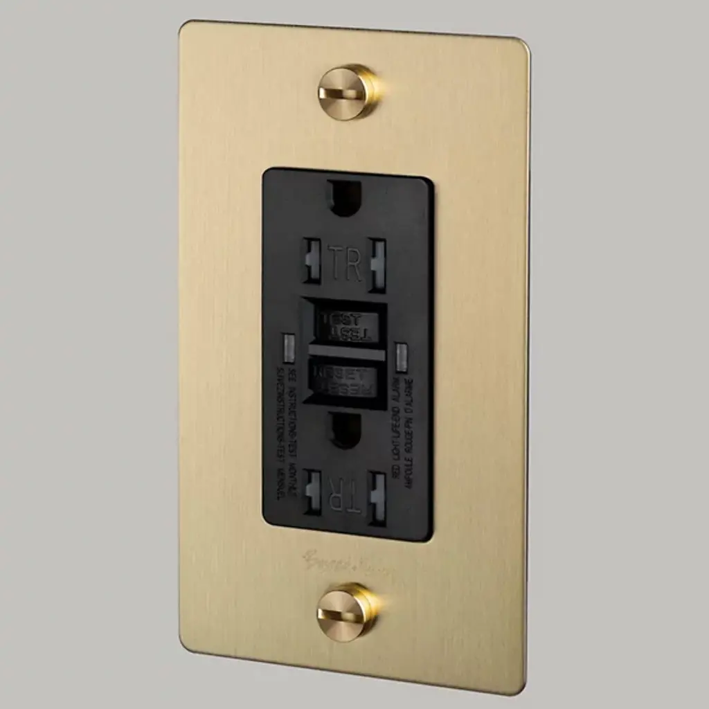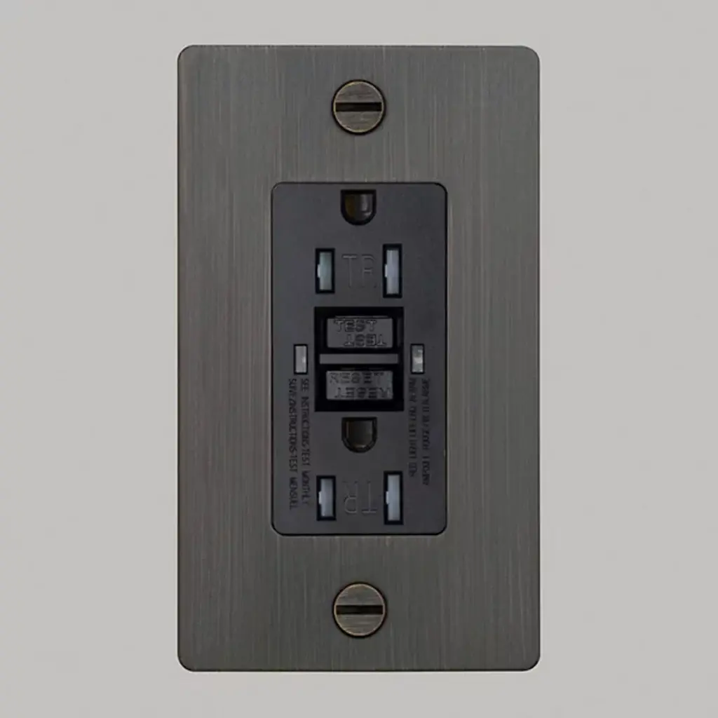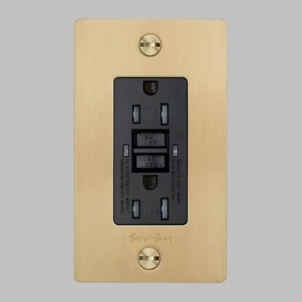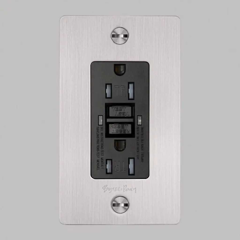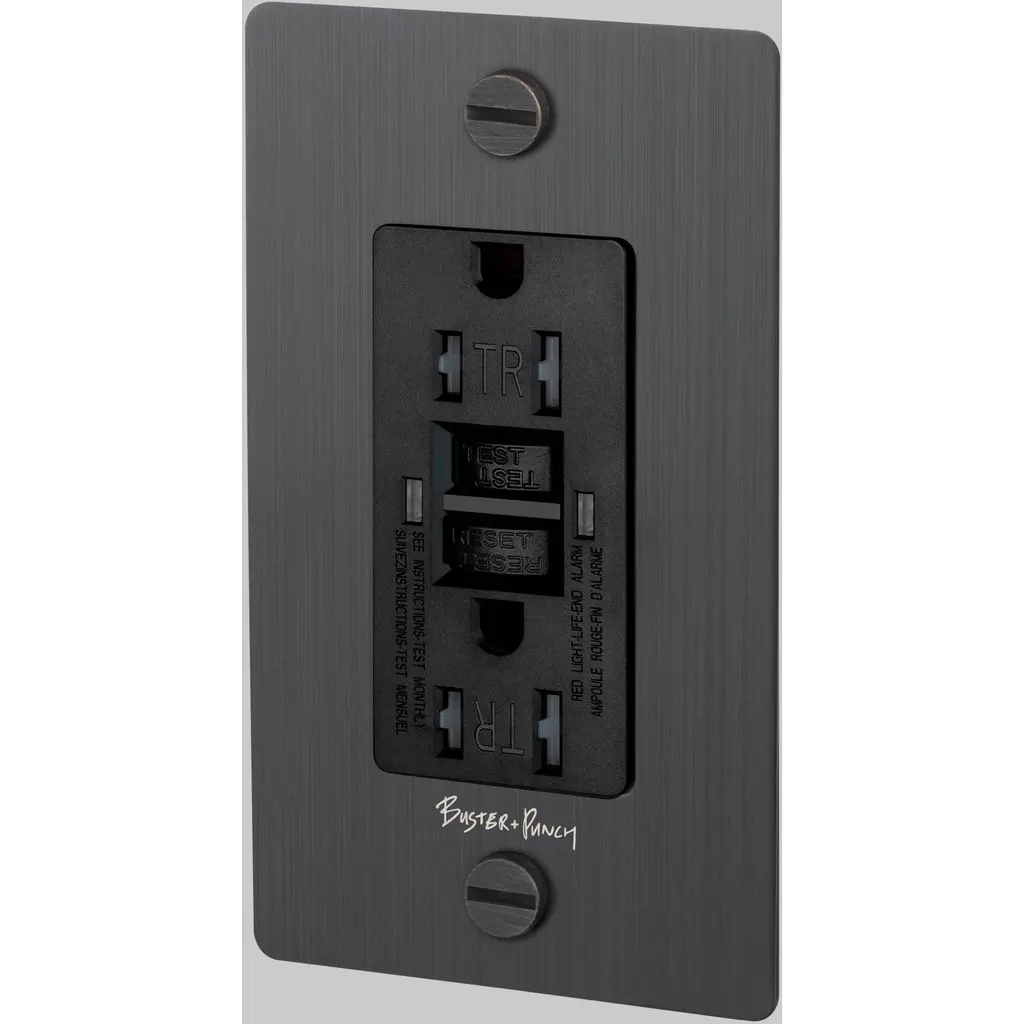 The 1-Gang Duplex Cross Outlet from Buster + Punch (B+P) is both simple and striking, featuring strong construction and solid functionality. The GFCI-rated outlet features clean, contemporary lines reinforced with industrial strength, complemented by a central plate that contrasts with the rich, textured metal of the rectangular wall plate. Two coin screws secure the wall plate in place, while the B+P logo, engraved across the wall plate, creates a distinctive look.