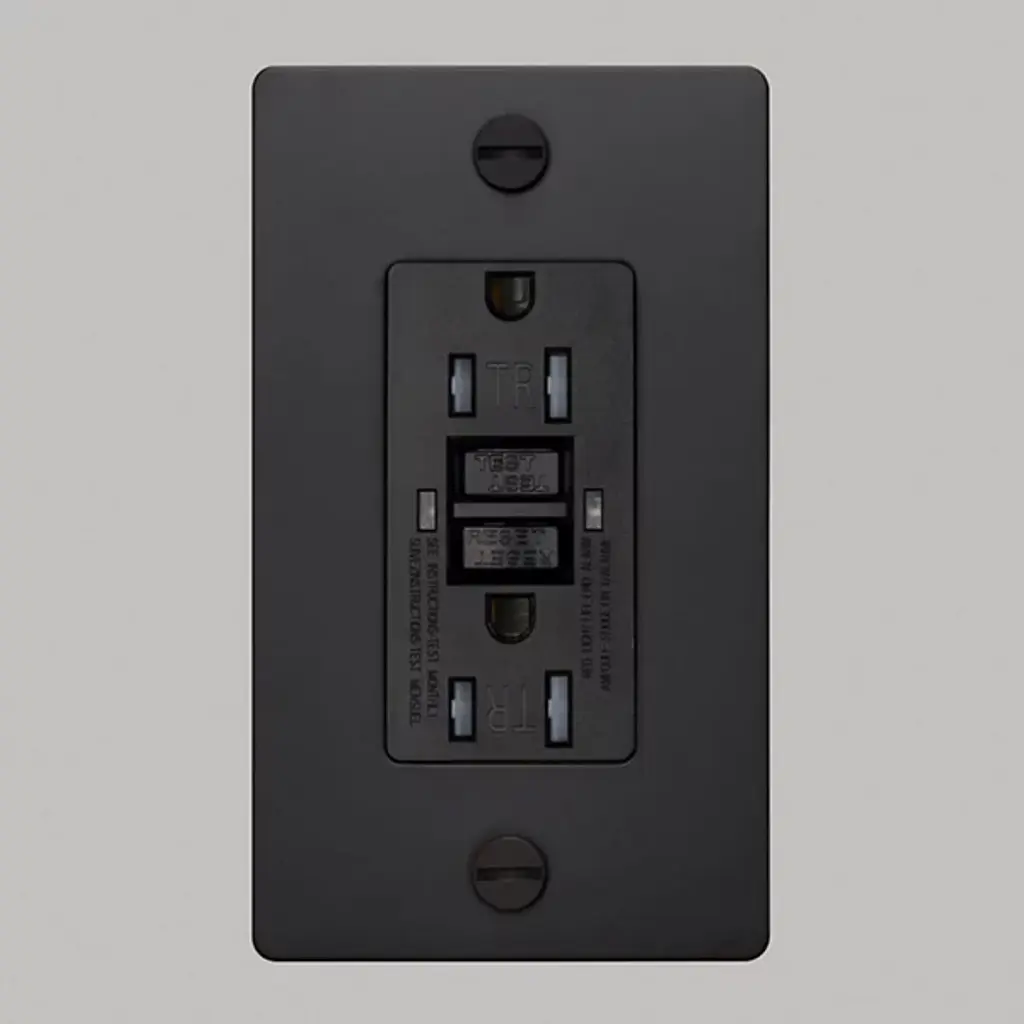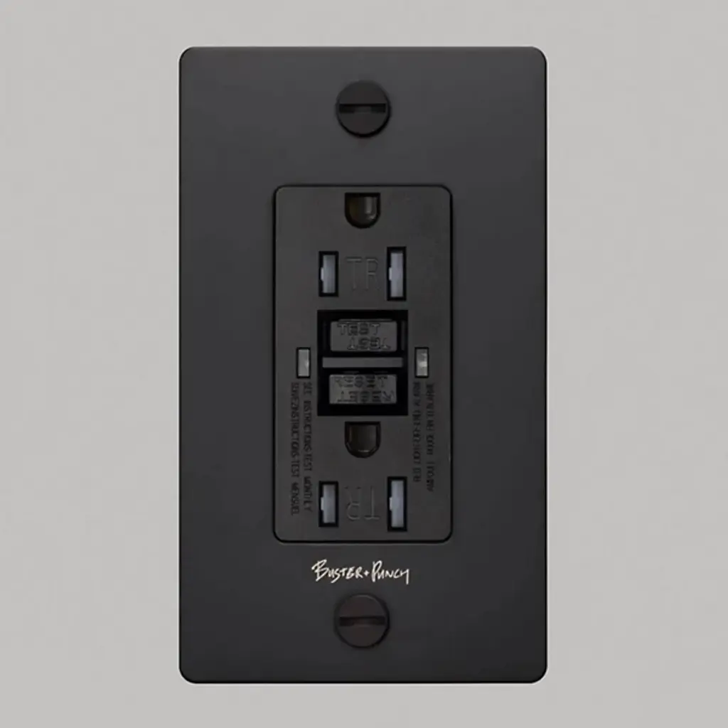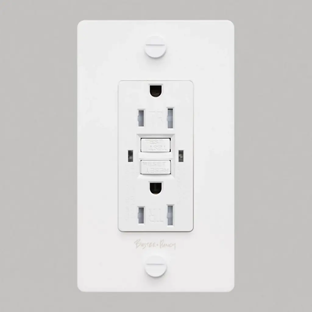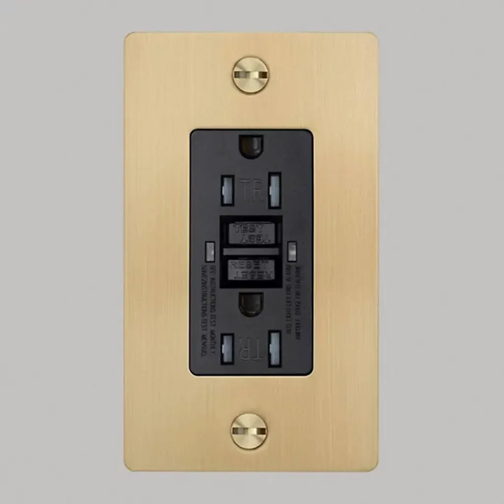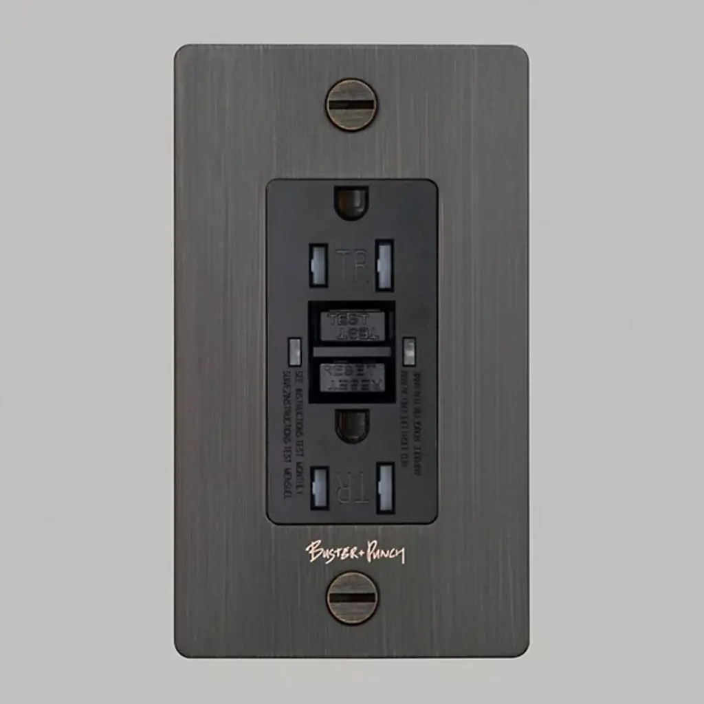 The 1-Gang Duplex Cross Outlet from Buster + Punch (B+P) is both simple and striking, featuring strong construction and solid functionality. The GFCI-rated outlet features clean, contemporary lines reinforced with industrial strength, complemented by a central plate that contrasts with the rich, textured metal of the rectangular wall plate. Two coin screws secure the wall plate in place, while the B+P logo, engraved across the wall plate, creates a distinctive look.