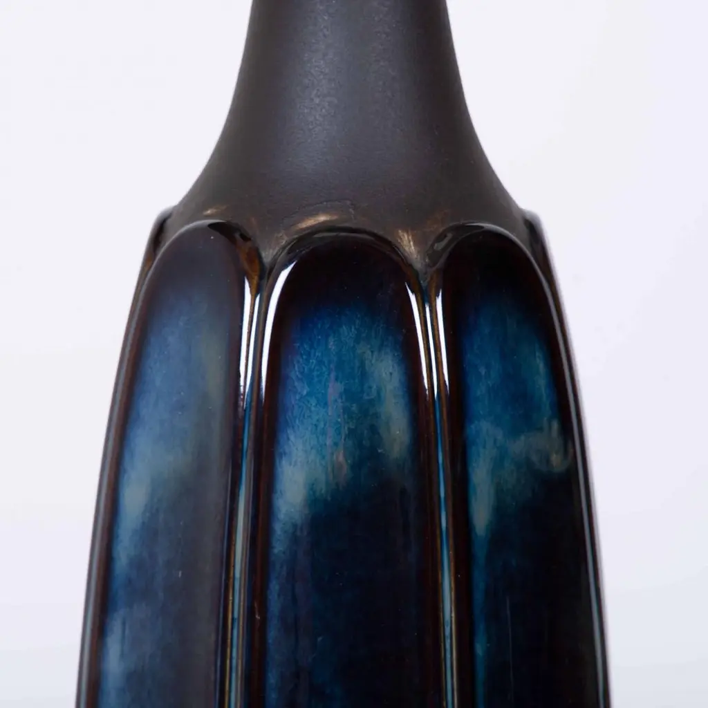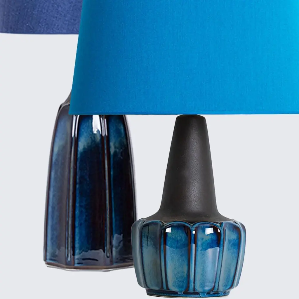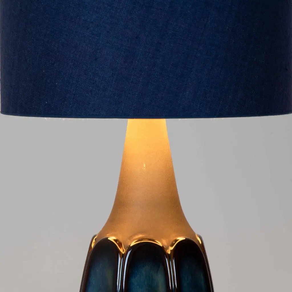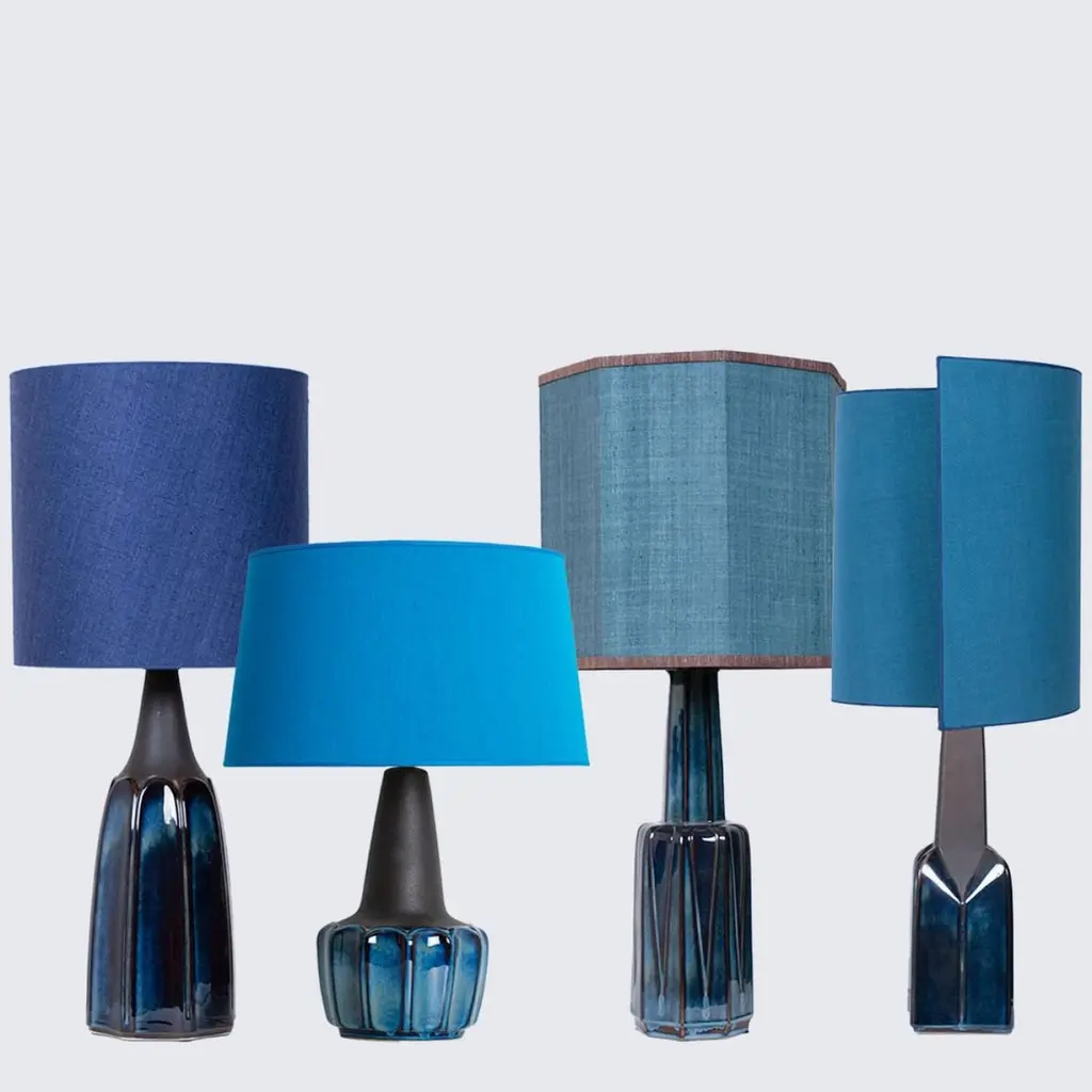 1 of the 4 ceramic table lamps by Soholm, 1960s. Sculptural pieces made of handmade ceramic in rich blue or grey tones, with a combination of dry and glazed finishes. With new custom made blue and brown silk lamp shades with warm gold or silver inner- shade by René Houben.The price is for one light, we have three available. Multiple combinations of shades are possible, please ask for more information.René Houben is a renowned Dutch light designer. René has been designing unique lamp shades for more than 25 years. From colorful and exuberant to modest. For every extraordinary lamp base (carefully selected antique and vintage items), he designs an applicable shade. His custom made creations are unique because of his interesting use of form and color. They also Stand out because of their indirect, soothing and intimate light. Houben is well known and loved by interior designers and decorators all-over Europe.Søholm, the oldest ceramic factory on Bornholm was founded by Herman Sonne Wolffsen and Edvard Christian Sonne in 1835. Søholm stoneware design has become a big collector’s item for retro devotees. The factory closed in 1996. Much of the pottery of Denmark matches the modernistic flare of the furniture they are so well known for. Sleek lines, innovative use of materials, and streamlined design are typical of the wares created and reflect the Danish modern style popularized in the 1950s and 1960s.