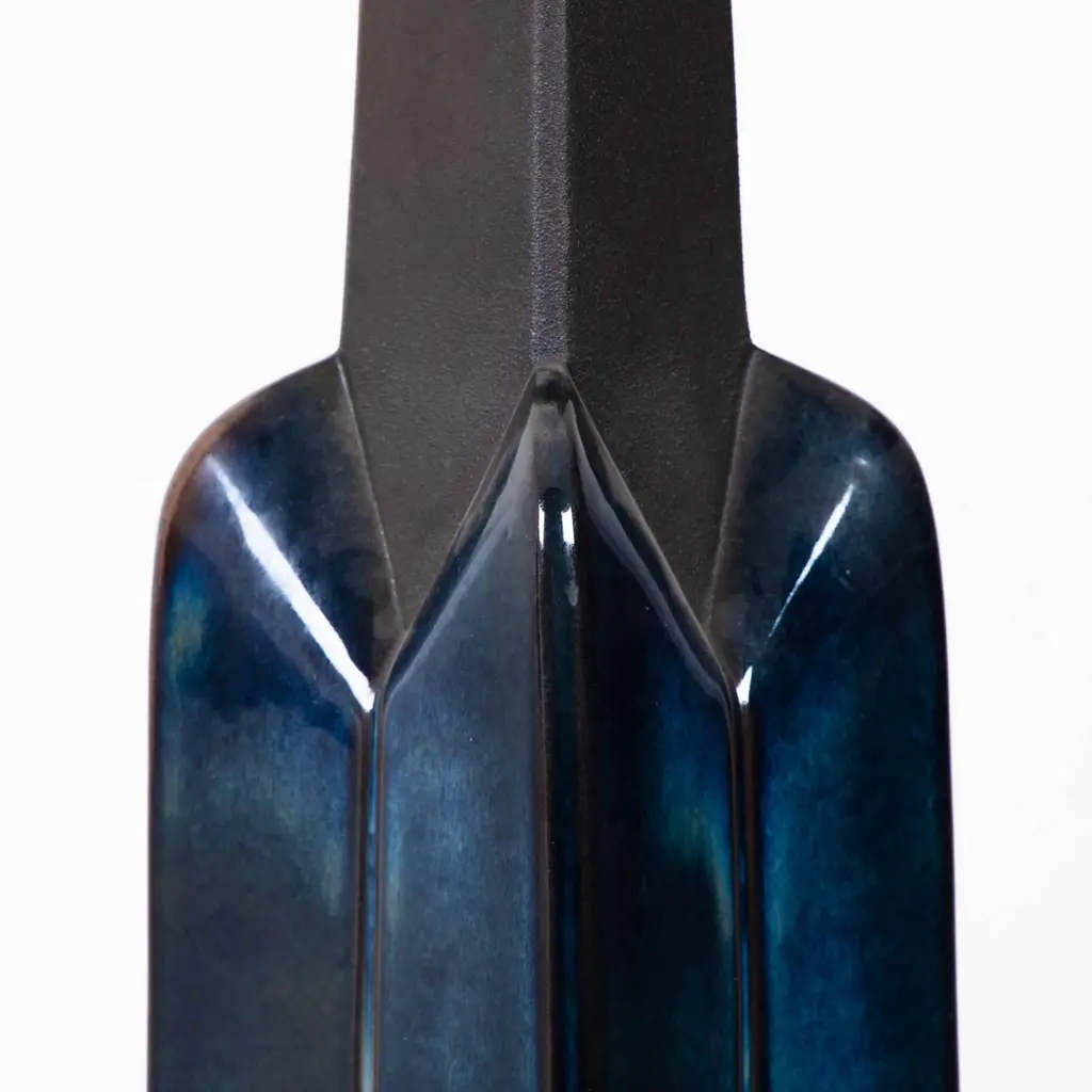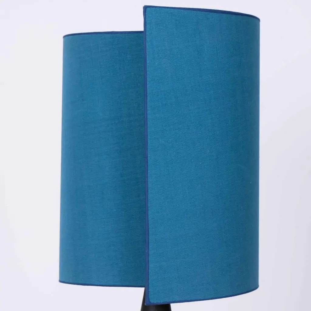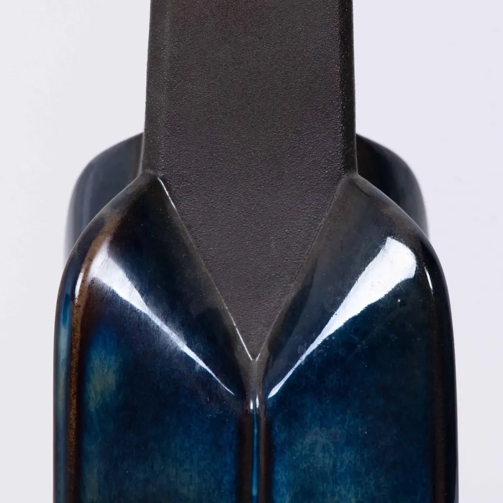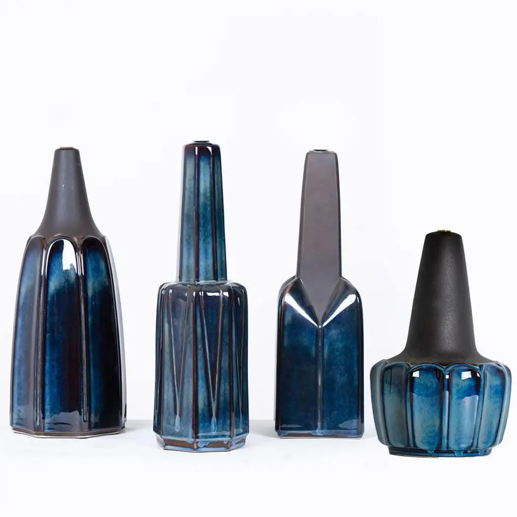 1 of the 4 ceramic table lamps by Soholm, 1960s. Sculptural pieces made of handmade ceramic in rich blue or grey tones, with a combination of dry and glazed finishes. With new custom made blue and brown silk lamp shades with warm gold or silver inner- shade by René Houben.The price is for one light, we have three available. Multiple combinations of shades are possible, please ask for more information.René Houben is a renowned Dutch light designer. René has been designing unique lamp shades for more than 25 years. From colorful and exuberant to modest. For every extraordinary lamp base (carefully selected antique and vintage items), he designs an applicable shade. His custom made creations are unique because of his interesting use of form and color. They also Stand out because of their indirect, soothing and intimate light. Houben is well known and loved by interior designers and decorators all-over Europe.Søholm, the oldest ceramic factory on Bornholm was founded by Herman Sonne Wolffsen and Edvard Christian Sonne in 1835. Søholm stoneware design has become a big collector’s item for retro devotees. The factory closed in 1996. Much of the pottery of Denmark matches the modernistic flare of the furniture they are so well known for. Sleek lines, innovative use of materials, and streamlined design are typical of the wares created and reflect the Danish modern style popularized in the 1950s and 1960s.