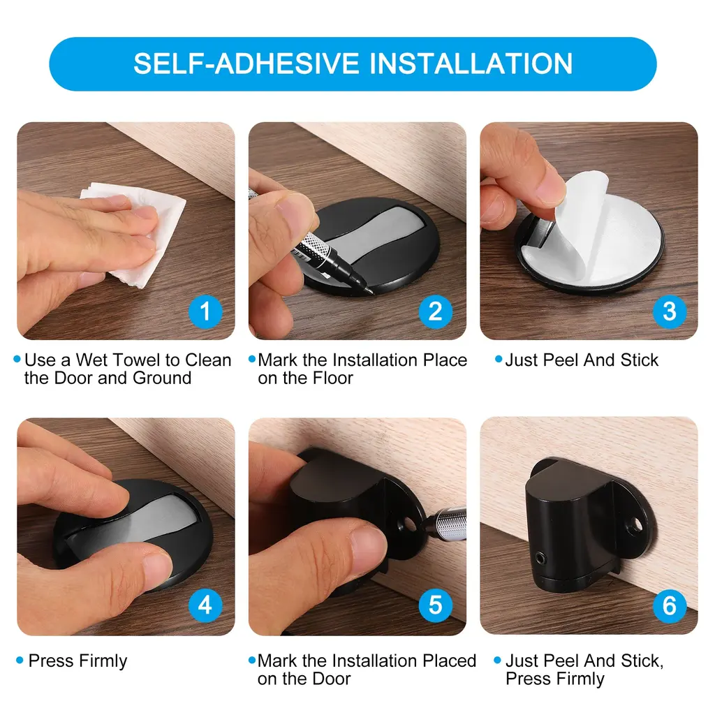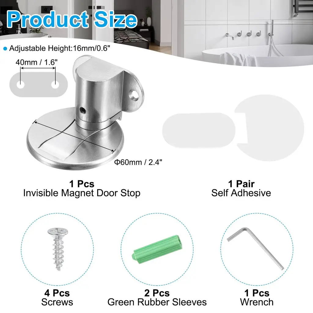 Magnet Door Holders can be used in home bedrooms, bathrooms, offices, entrances, hotels, apartments, or other places.SpecificationColor: SilverMaterial: Zinc AlloyHole Center Distance: 40mm/1.6inchAdjustable Height: 16mm/0.6inchOriginal Plate Diameter: 60mm/2.4inchPackage List: 1 x Invisible Magnet Door Stop, 4 x Screw Mount, 2 x Self Adhesive & Green Rubber Sleeves, 2 x WrenchAdvantageThe Door Stopper Magnet prevents the door from being blown over by the wind and prevents the door from closing suddenly. Magnetic door stops are placed on the floor without bumps, won't trip over feet, and doors near the stopper will out.InstructionMagnetic Door Stoppers provide two different installation methods1. free of holes: Adhesive stickers a tear sticky an easy and convenient installation (need to be static 24H after use)2. holes: screws installed, double-hole mounting stable and solid!NOTE: The door stop can be adjusted to suit the height of the doorway up to 16mm/0.6inch.The magnetic door stop installation is suitable for floors as thick as 4.8mm/0.19 inches, check the door gap before you buy.