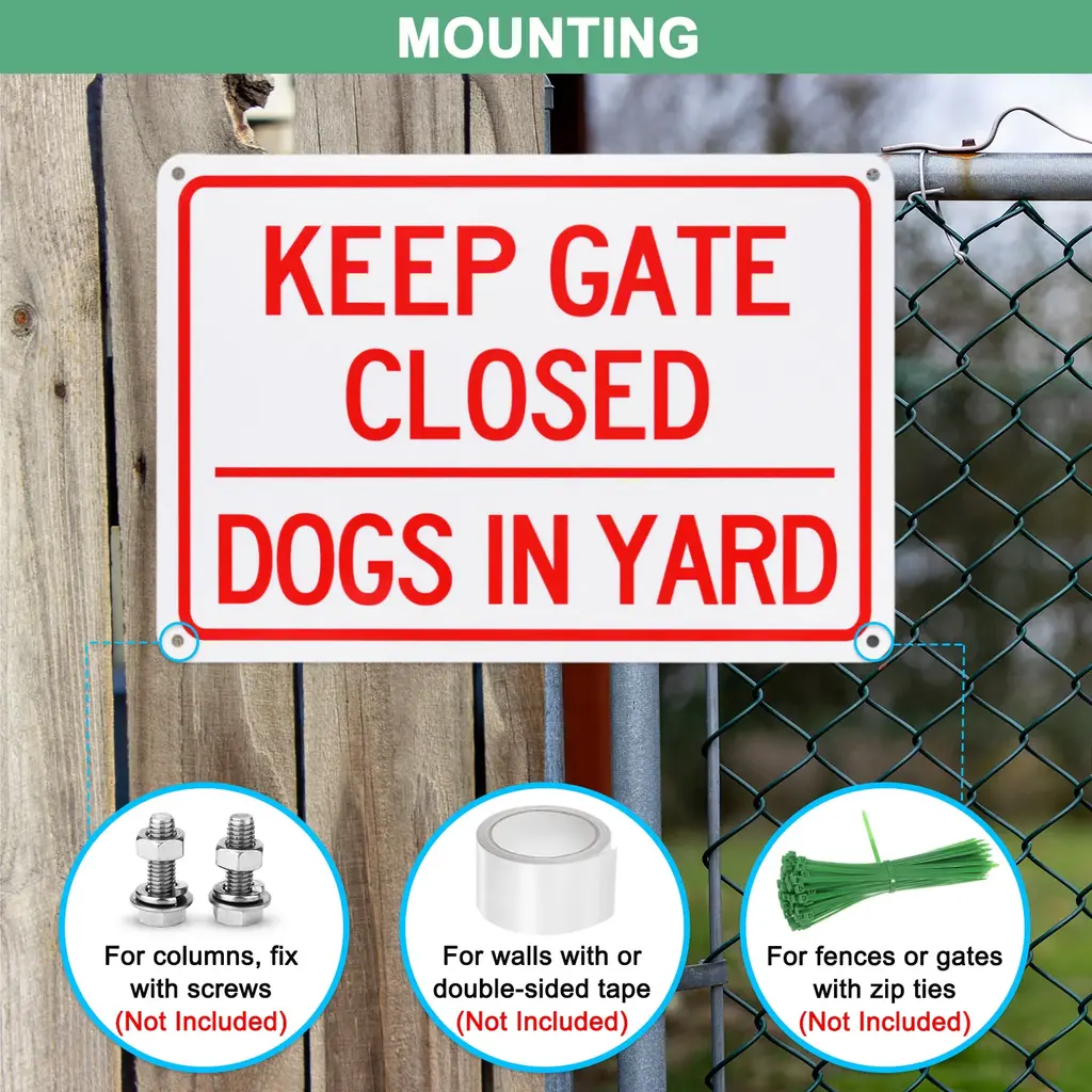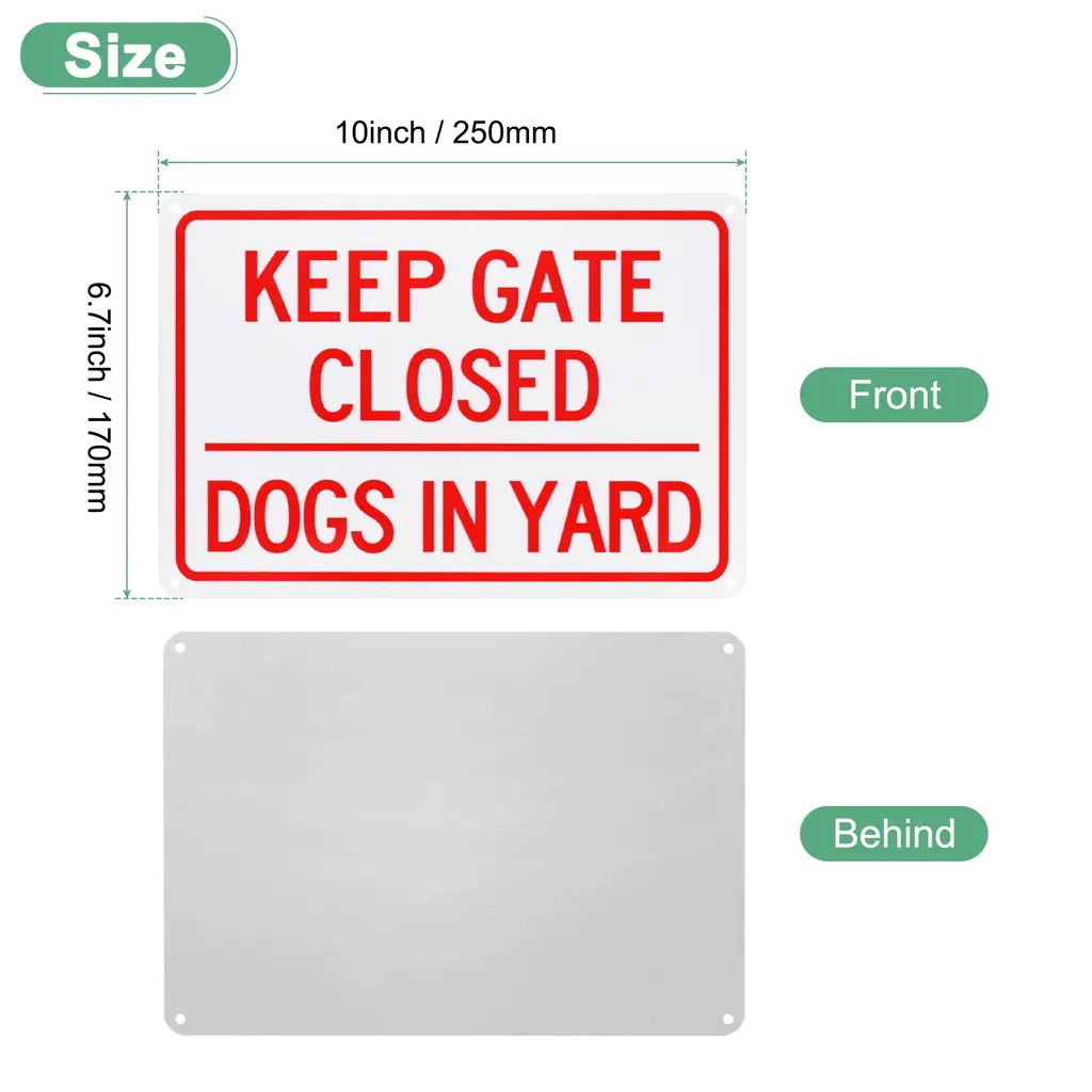 PRODUCT APPLICATIONSOur aluminum reflective signs are versatile. They can be placed in homes, offices, commercial buildings, and various places where they are needed. Its clear text can warn others easily.PRODUCT DETAILS & INCLUDE√ Material: Aluminum√ Color: Red on White√ Overall Size: 250mm x 170 mm / 10" x 6.7"(L x W)√ Package Includes: 1Pcs x Keep Gate Closed Dogs in Yard SignPRODUCT ADVANTAGES1. Our rust-free signs are made of high-strength rust-free aluminum with excellent durability, waterproof and anti-corrosion properties, not easy to bend and deform, and can be used indoors or outdoors for a long time without color fading or rusting.2. Our signboard is manufactured using a high-tech printing process with vibrant colors and eye-catching lettering, it is also reflective to remind others in the dark. It is a great choice for daily warning signsINSTALLATIONThis sign has pre-drilled holes so you can use zip ties, screws, double-sided tape, nuts, and bolts (installation accessories are not included), it can be mounted wherever you need it.
