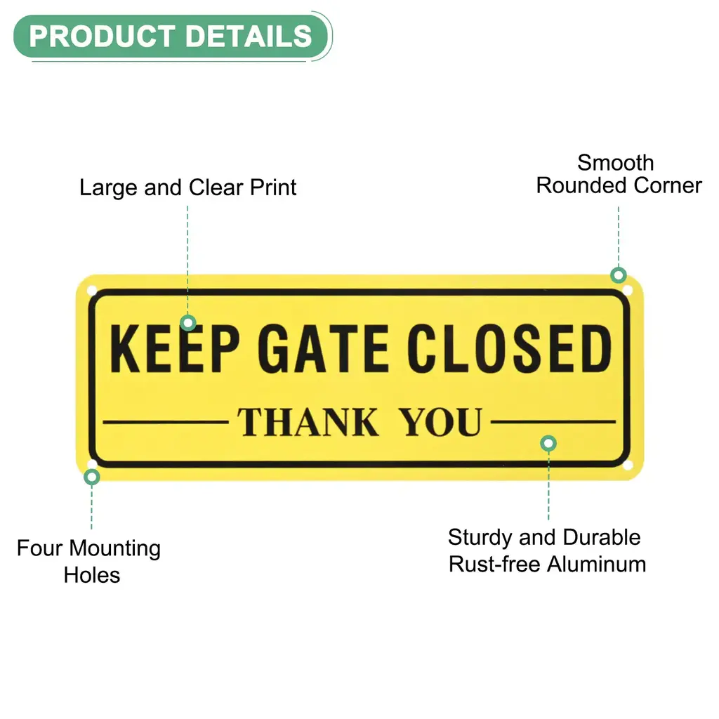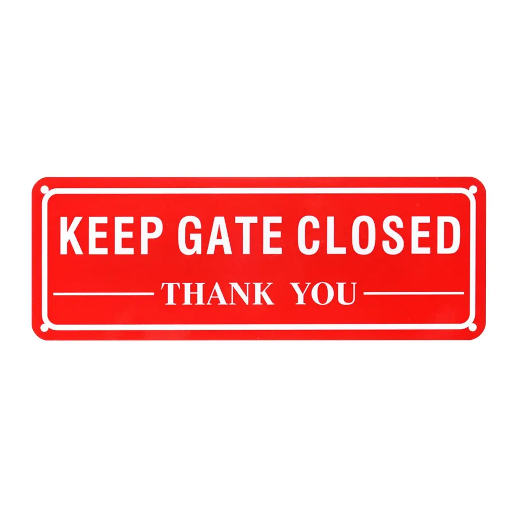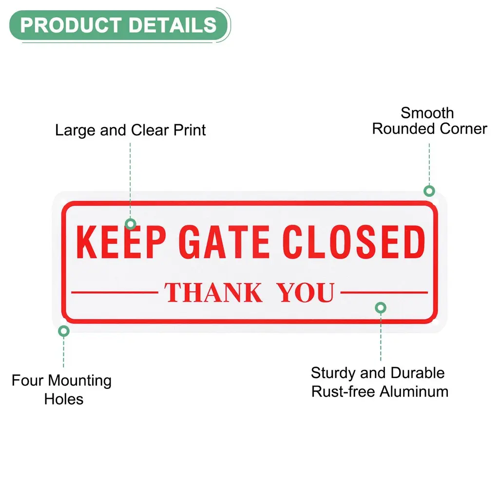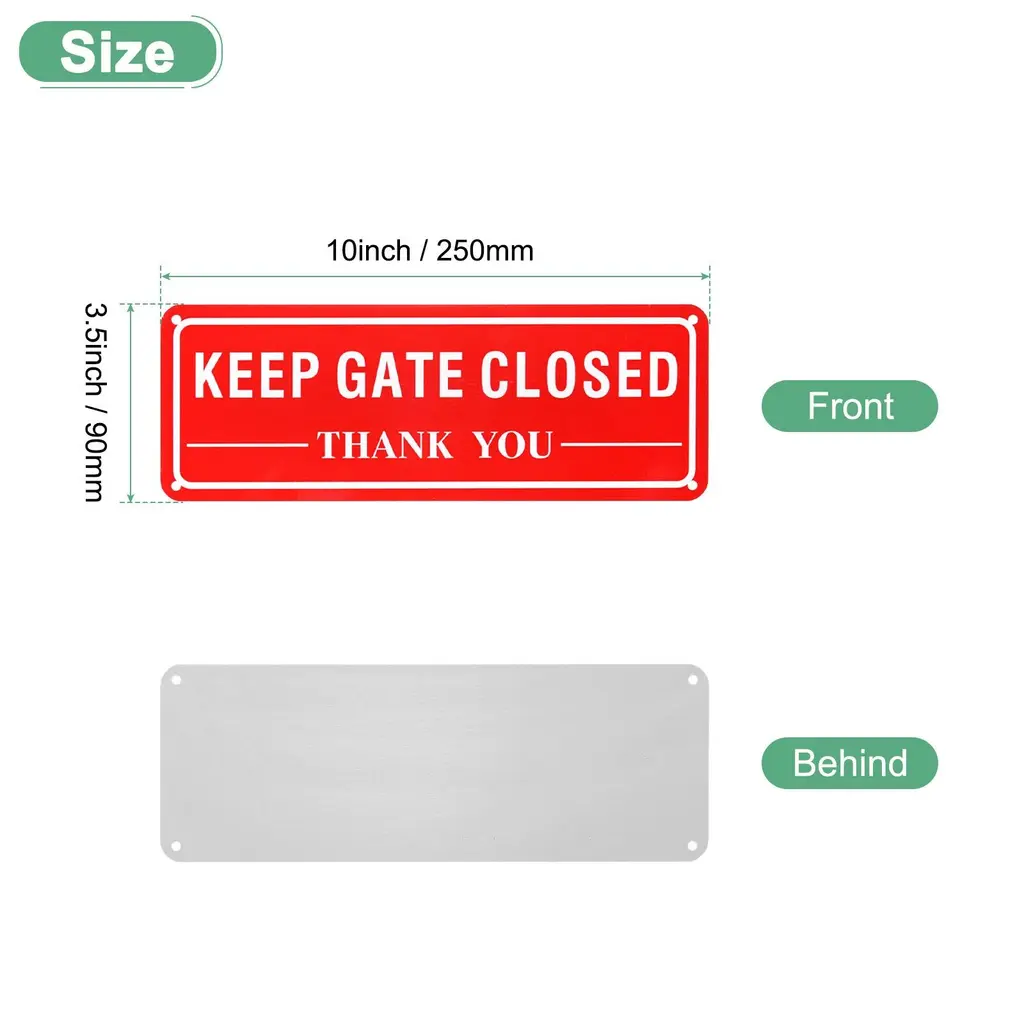 PRODUCT APPLICATIONSOur aluminum reflective signs are versatile. They can be placed in homes, offices, commercial buildings, and various places where they are needed. Its clear text can warn others easily.PRODUCT DETAILS & INCLUDE√ Material: Aluminum√ Color: White on Red√ Overall Size: 250mm x 90 mm / 10" x 3.5"(L x W)√ Package Includes: 1Pcs x Keep Gate Closed Thank you SignPRODUCT ADVANTAGES1. Our rust-free signs are made of high-strength rust-free aluminum with excellent durability, waterproof and anti-corrosion properties, not easy to bend and deform, and can be used indoors or outdoors for a long time without color fading or rusting.2. Our signboard is manufactured using a high-tech printing process with vibrant colors and eye-catching lettering, it is also reflective to remind others in the dark. It is a great choice for daily warning signsINSTALLATIONThis sign has pre-drilled holes so you can use zip ties, screws, double-sided tape, nuts, and bolts (installation accessories are not included), it can be mounted wherever you need it.