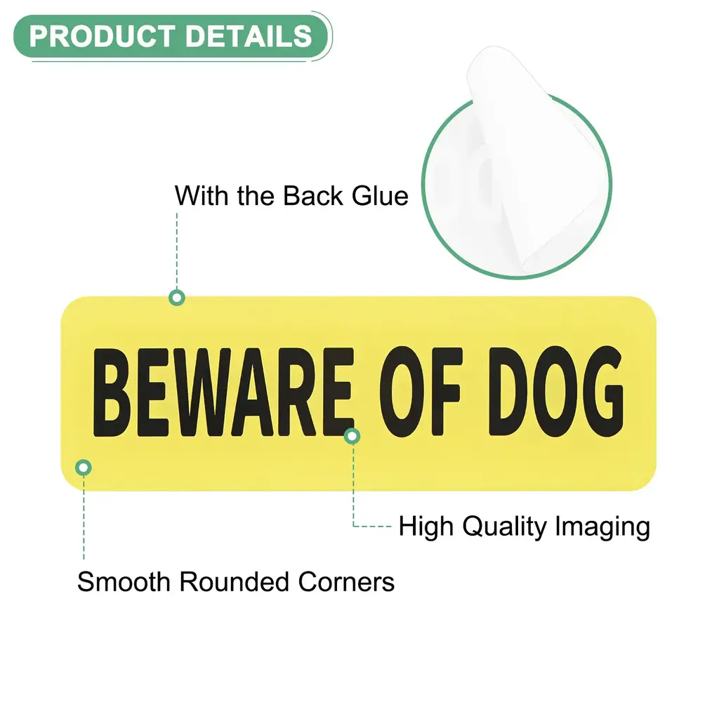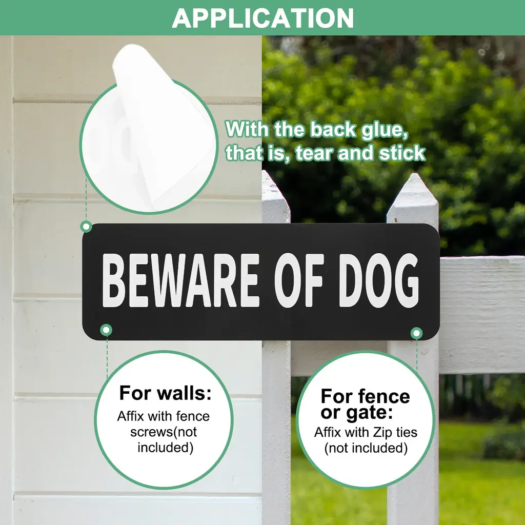 PRODUCT APPLICATIONSThis door sign is universal for various applications. They can be used indoors or outdoors, home, yard, door, etc.PRODUCT DETAILS & INCLUDE√ Material: Acrylic with adhesive backing√ Color: White Letters On Black Background√ Diameter: 9x3 Inch(L*W); Height: 4.5mm/0.18 Inch √ Package Includes: 1-Pack x Beware of Dog for HomePRODUCT ADVANTAGES1. Dog signs are made of acrylic, which is durable, anti-rust, and waterproof, it has good wear resistance and can be used for a long time.2. This yard sign has the back glue, and rounded corners designed for easier installation, that is, tear and stick. Alerts some people, couriers, and visitors to the presence of a dog in the yard, ensuring safety for both pets and people.ATTENTIONBecause of the light, the color and size will be slightly wrong.