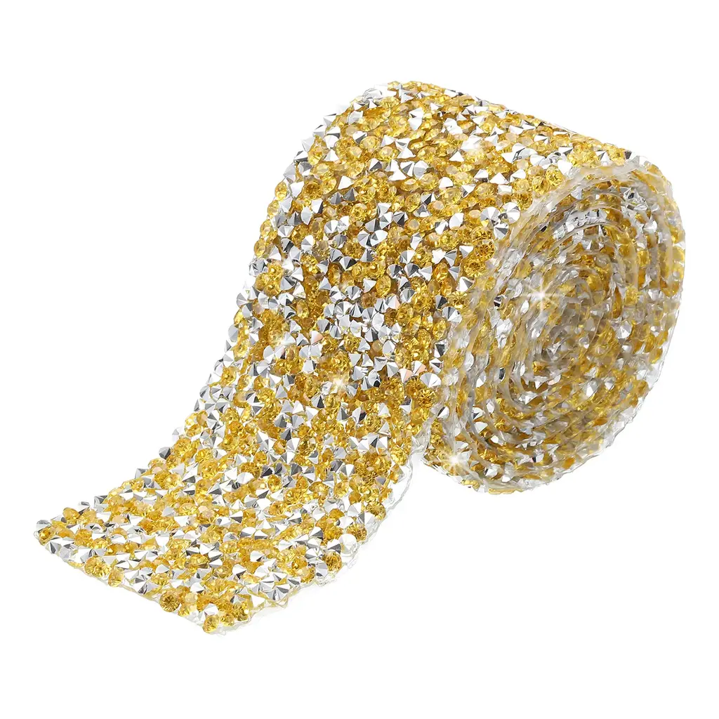 What is this?Crystal belts can mainly be used to decorate different occasions and items in your life. You can use it for decoration of furniture, cakes or handicrafts, and you can also use it for decoration on different parties, such as weddings, birthday parties, and other holidays, etc.What will I get?Color: Silver Base YellowMaterial: ResinEach Size(L*W):90cm x 4cm/1 Yards x 1.57 inches;In the package of: 1 Roll x Diamond RibbonAre there any advantages of the product?1. This crystal ribbon is made of resin, using good craftsmanship to make all the surfaces shine, smooth and flat, and they are bling no matter under natural light or light.2. The resin diamond ribbon has a double-sided tape, you can cut the size you want according to your needs, directly tear off the tape on the back during use, and stick it directly on the surface of the item.3. The decoration sticker are not easy to fall off, and the adhesive performance is stable. You can use it to easily stick to the surface of the itemsHow to use it?You just need to cut the diamond gems sticker to the length you need and use it to diy your items. Wipe the surface of the item before use, then tear off the adhesive sticker and stick it onWhat should I notice?Within 48 hours of use, do not let the craft come into contact with liquids