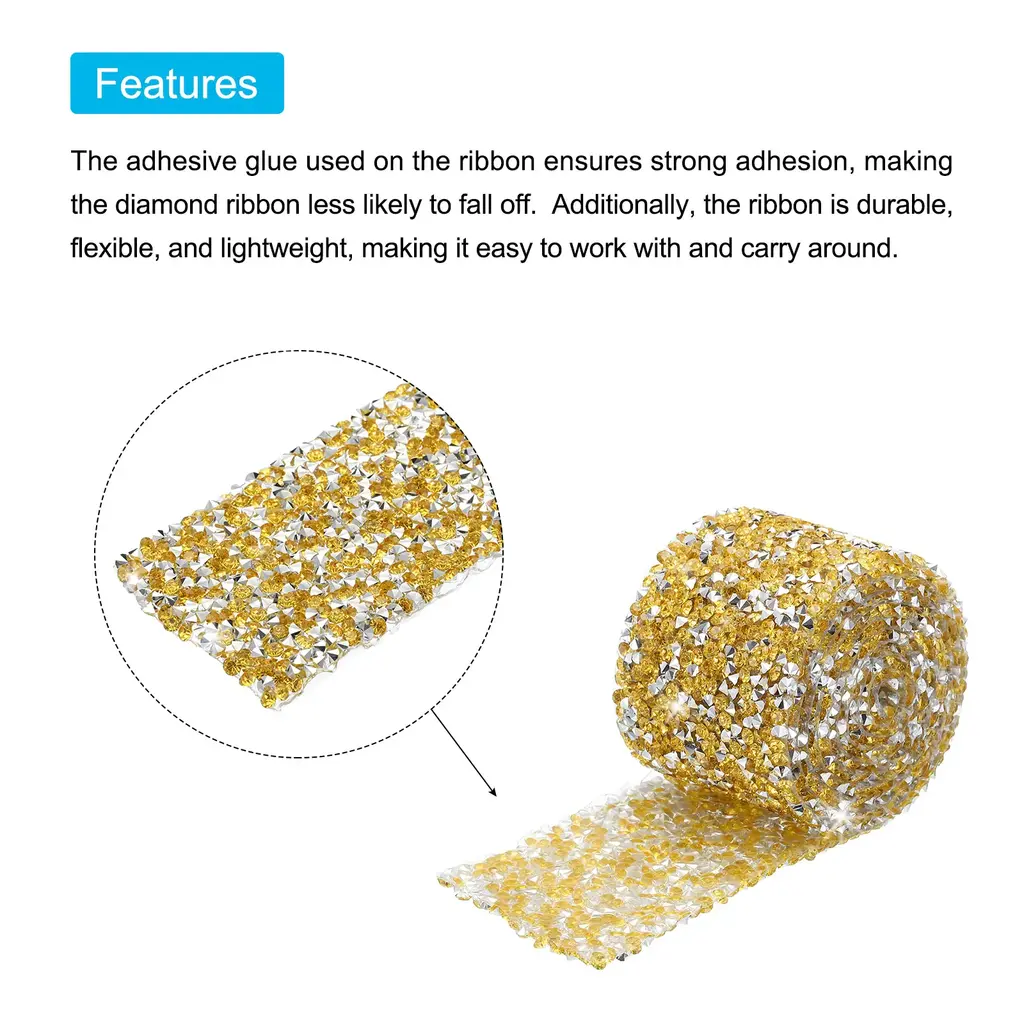 What is this?Crystal belts can mainly be used to decorate different occasions and items in your life. You can use it for decoration of furniture, cakes or handicrafts, and you can also use it for decoration on different parties, such as weddings, birthday parties, and other holidays, etc.What will I get?Color: Silver Base YellowMaterial: ResinEach Size(L*W):90cm x 4cm/1 Yards x 1.57 inches;In the package of: 1 Roll x Diamond RibbonAre there any advantages of the product?1. This crystal ribbon is made of resin, using good craftsmanship to make all the surfaces shine, smooth and flat, and they are bling no matter under natural light or light.2. The resin diamond ribbon has a double-sided tape, you can cut the size you want according to your needs, directly tear off the tape on the back during use, and stick it directly on the surface of the item.3. The decoration sticker are not easy to fall off, and the adhesive performance is stable. You can use it to easily stick to the surface of the itemsHow to use it?You just need to cut the diamond gems sticker to the length you need and use it to diy your items. Wipe the surface of the item before use, then tear off the adhesive sticker and stick it onWhat should I notice?Within 48 hours of use, do not let the craft come into contact with liquids