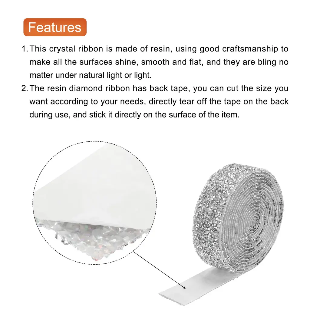 What is this?Crystal belts can mainly be used to decorate different occasions and items in your life. You can use it for decoration of furniture, cakes or handicrafts, and you can also use it for decoration on different parties, such as weddings, birthday parties, and other holidays, etc.What will I get?Color: WhiteMaterial: ResinEach Size(L*W):270cm x 3cm/3 Yards x 1.18 inches;In the package of: 1 Roll x Diamond RibbonAre there any advantages of the product?1. This crystal ribbon is made of resin, using good craftsmanship to make all the surfaces shine, smooth and flat, and they are bling no matter under natural light or light.2. The resin diamond ribbon has a double-sided tape, you can cut the size you want according to your needs, directly tear off the tape on the back during use, and stick it directly on the surface of the item.3. The decoration sticker are not easy to fall off, and the adhesive performance is stable. You can use it to easily stick to the surface of the itemsHow to use it?You just need to cut the diamond gems sticker to the length you need and use it to diy your items. Wipe the surface of the item before use, then tear off the adhesive sticker and stick it onWhat should I notice?Within 48 hours of use, do not let the craft come into contact with liquids
