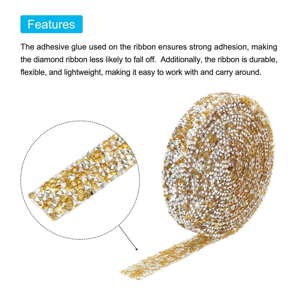 What is this?Crystal belts can mainly be used to decorate different occasions and items in your life. You can use it for decoration of furniture, cakes or handicrafts, and you can also use it for decoration on different parties, such as weddings, birthday parties, and other holidays, etc.What will I get?Color: Silver Base YellowMaterial: ResinEach Size(L*W):270cm x 1.5cm/3 Yards x 0.59 inches;In the package of: 1 Roll x Diamond RibbonAre there any advantages of the product?1. This crystal ribbon is made of resin, using good craftsmanship to make all the surfaces shine, smooth and flat, and they are bling no matter under natural light or light.2. The resin diamond ribbon has a double-sided tape, you can cut the size you want according to your needs, directly tear off the tape on the back during use, and stick it directly on the surface of the item.3. The decoration sticker are not easy to fall off, and the adhesive performance is stable. You can use it to easily stick to the surface of the itemsHow to use it?You just need to cut the diamond gems sticker to the length you need and use it to diy your items. Wipe the surface of the item before use, then tear off the adhesive sticker and stick it onWhat should I notice?Within 48 hours of use, do not let the craft come into contact with liquids