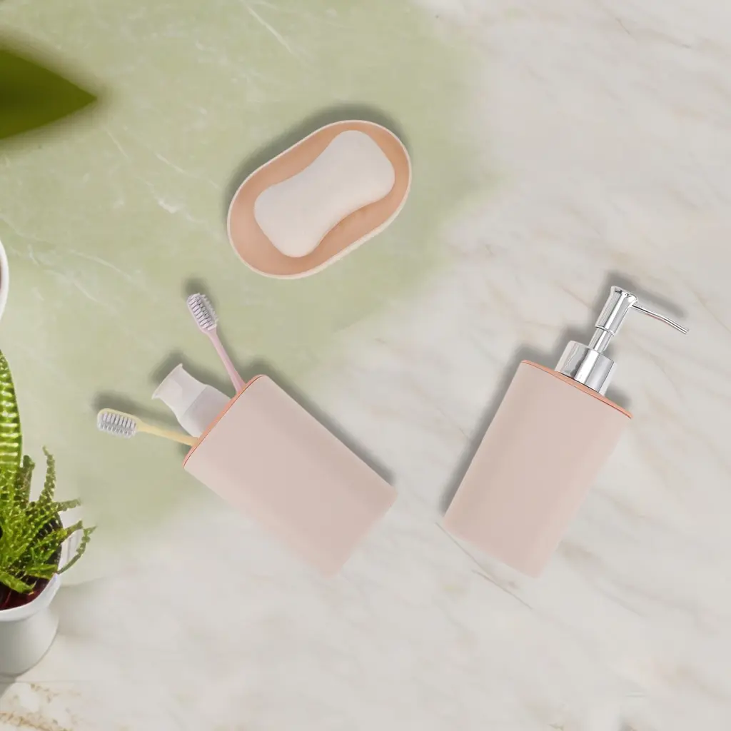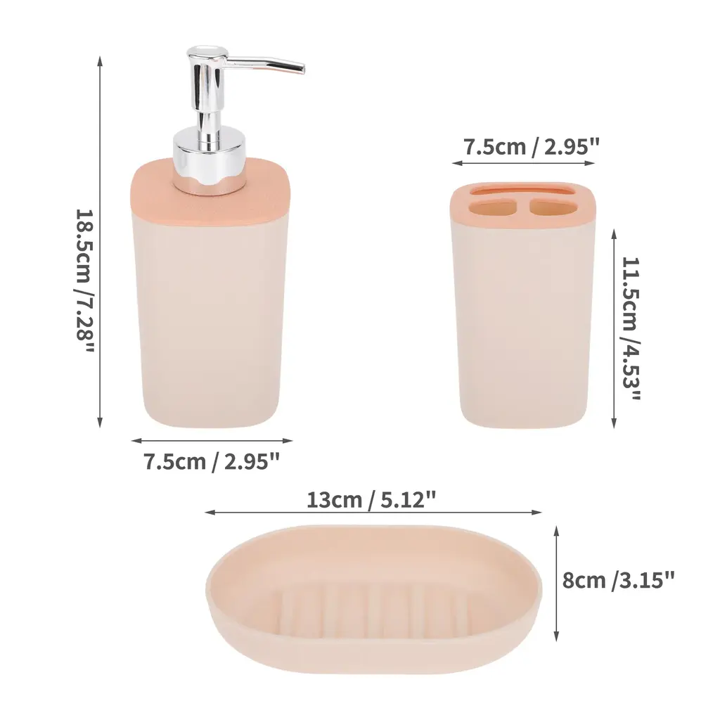 Features: Complete 3 pieces set, includes 1 x soap dispenser, 1 x toothbrush holder, and 1 x soap dish.The soap dish and toothbrush holder set easy to clean, wipe it with a soft cloth or just rinse it with water. The smooth surface feel nice to touch, there's no rough edges anywhere. If you are searching for a personalized gift for someone, such as housewarming, Christmas, weddings, birthdays, Mother's Day, Valentine's Day or Thanksgiving, our product is the ideal choice. Please Note: Please allow 1-3mm measuring deviation due to manual measurement.Specifications: Product Name: Bathroom Accessories SetColor: PinkMaterial: PlasticSoap Dispenser Size: 7.5x18.5cm / 2.95"x7.28"(L*H)Toothbrush Holder Size: 7.5x11.5cm / 2.95"x4.53"(L*H)Soap Dish Size: 13x8x2.3cm / 5.12"x3.15"x0.91"(L*W*H)Package List: 1 Set Bathroom Accessories Kit