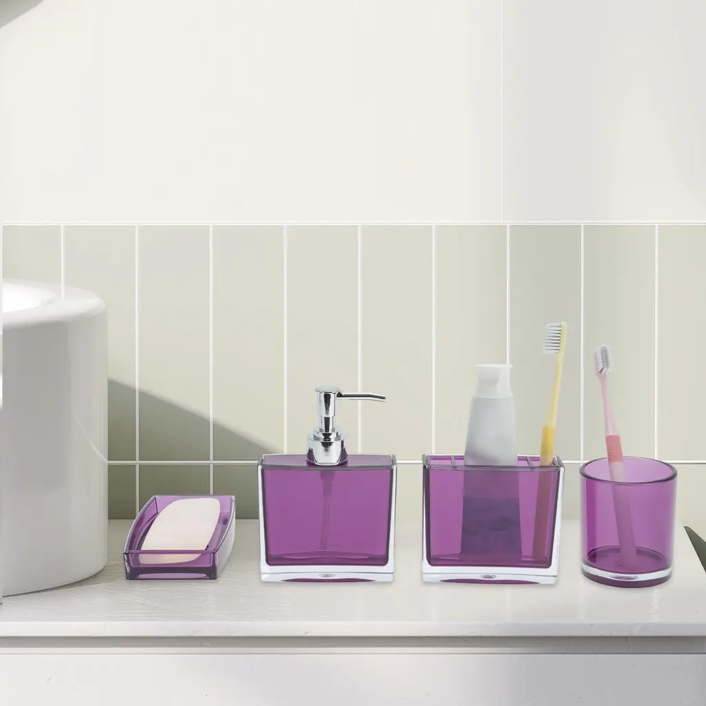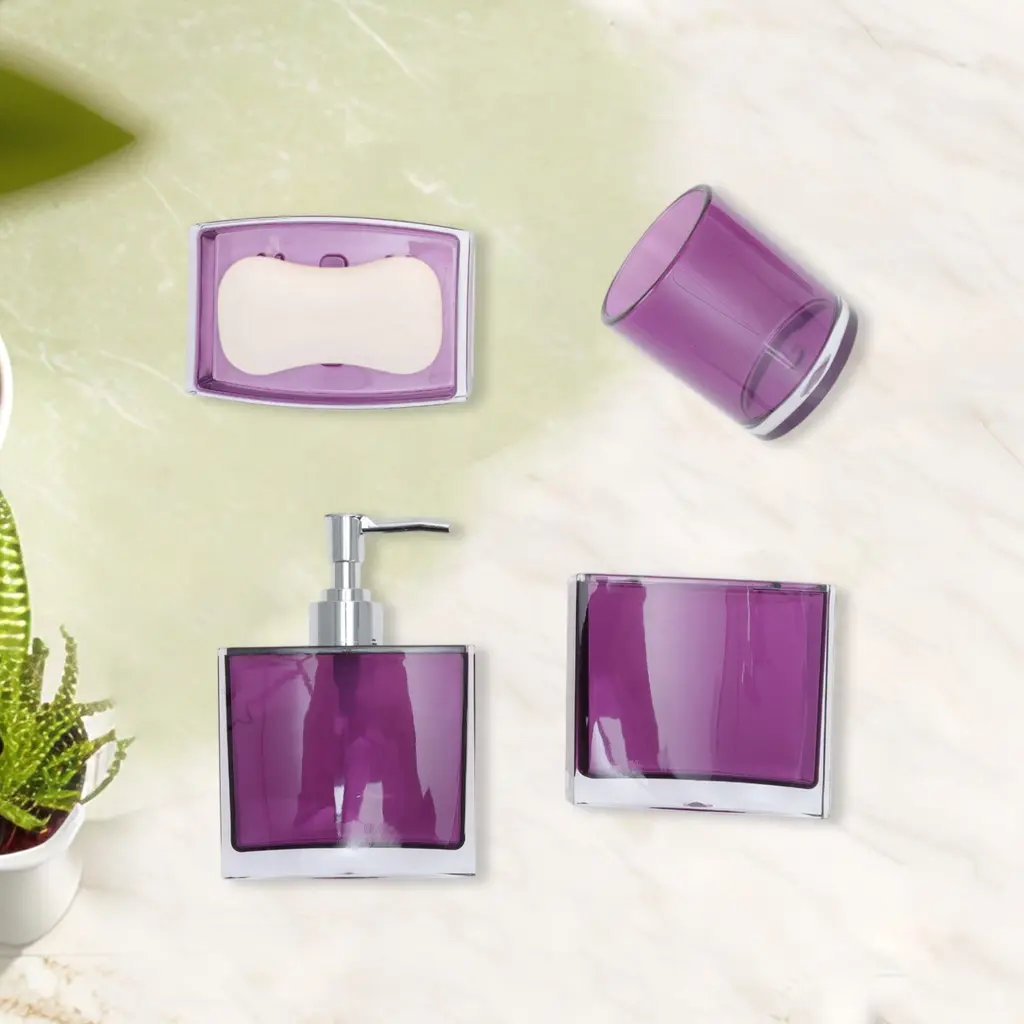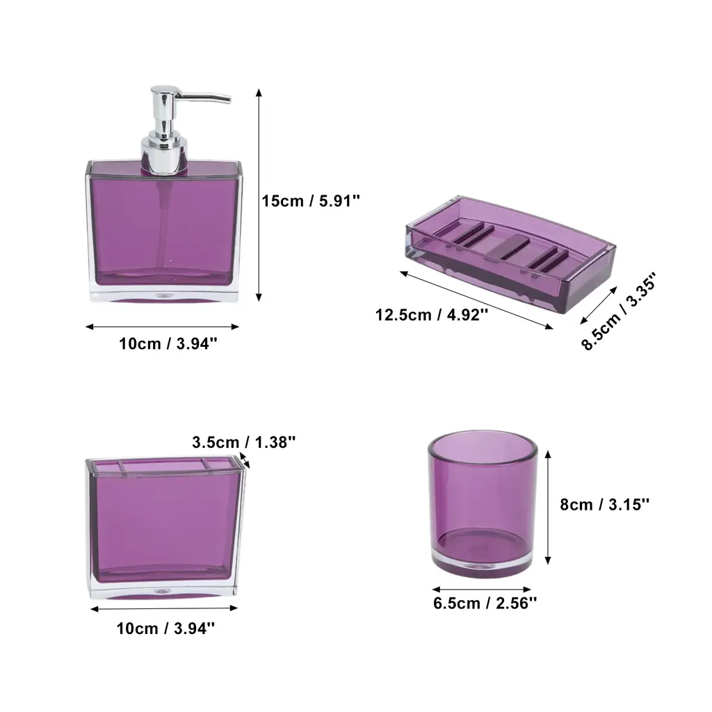 Features:Complete 4 pieces set, includes 1 x toothbrush holder,1 x mouthwash cup,1 x lotion bottle and 1 x soap box.The soap dish and toothbrush holder set easy to clean, wipe it with a soft cloth or just rinse it with water. The smooth surface feel nice to touch, there's no rough edges anywhere.If you are searching for a personalized gift for someone, such as housewarming, Christmas, weddings, birthdays, Mother's Day, Valentine's Day or Thanksgiving, our product is the ideal choice.Please Note: Please allow 1-3mm measuring deviation due to manual measurement.Specifications:Product Name: Bathroom Accessories SetMaterial: PSColor: PurpleToothbrush Holder Size: 10x3.5cm / 3.94''x1.38''(L*W)Mouthwash Cup Size: 8x6.5cm / 3.15''x2.56''(L*W)Lotion Bottle Size: 15x10cm / 5.91''x3.94''(L*W)Soap Box Size: 12.5x8.5cm / 4.92''x3.35''(L*W)Package List:1 Set Bathroom Accessories Set