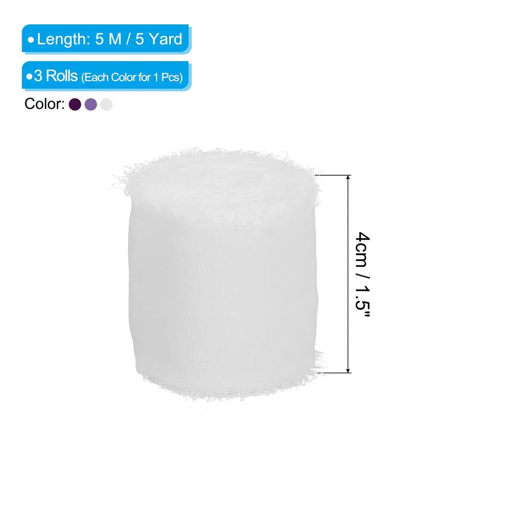 Chiffon ribbon is a versatile and stylish decorative accessory that is widely used to add an elegant touch to various items such as gift wrapping, bridal bouquets, wedding invitation decorations, and DIY craft projects.SpecificationColor: White/Cream White/Beige/ChampagneMaterial: ChiffonLength: 5 M / 5 YardWidth: 4cm / 1.5 inchPacking List: 1 Set/4 Rolls x Fringe Silk Ribbon (1 roll per color)AdvantageThe ribbon is made of durable chiffon material with frayed edges design. The silk ribbon has a smooth, soft and delicate texture, as well as vibrant color, making it the perfect elegant finishing touch for your decoration projects.InstructionEasy to use, you can wrap the ribbon around gifts and tie it into a bow, or wrap it around the stems of a bouquet.NOTE: Due to the difference in natural light and display resolution, the item color displayed in photos may be slightly different from the real object.