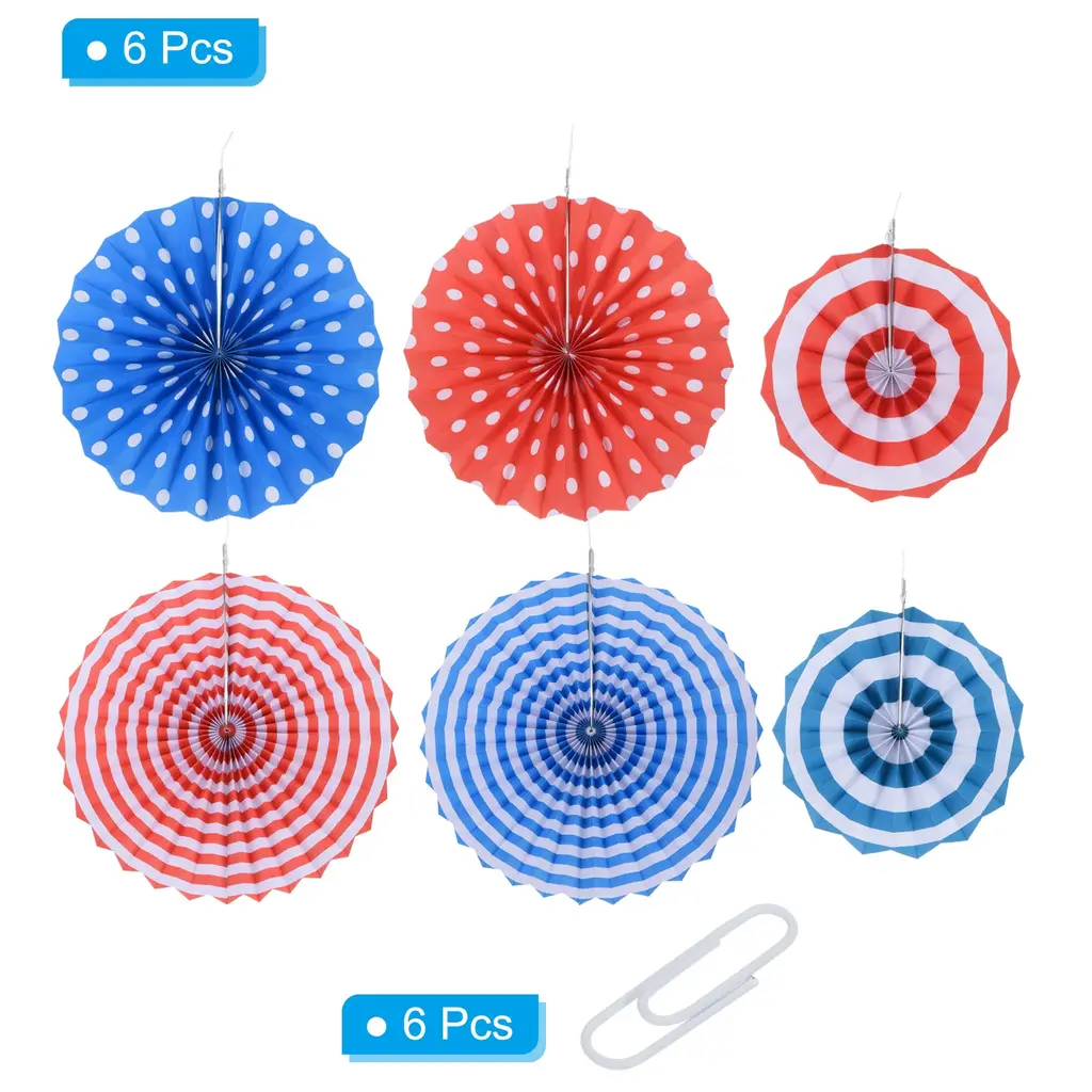 Hanging paper fans have various applications, perfect for weddings, birthday, graduation, festivals, party, bridal shower, special event, Valentine's day, anniversary and other occasions setting to make your decoration become warm and romantic.Specification Color: Red BlueMaterial: PaperDiameter: 20cm/8", 30cm/12", 40cm/16"Packing List: 1 Set (6Pcs) x Honeycomb Paper Fans with Pins (each size of 2pcs)AdvantageThese round paper fans are made of pleated sturdy paper with bright color and beautiful appearance. They are not easy to tear or lose their shape, not easy to fade and reusable.InstructionUnfold the fan, secure the ends together with pins (included), and hang the string on the wall or anywhere you want to decorate.NOTE: Due to the difference in natural light and display resolution, the item color displayed in photos may be showing slightly different from the real object.