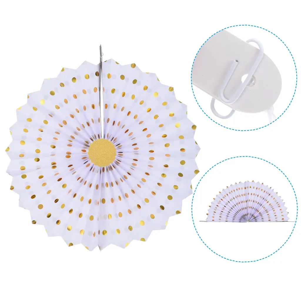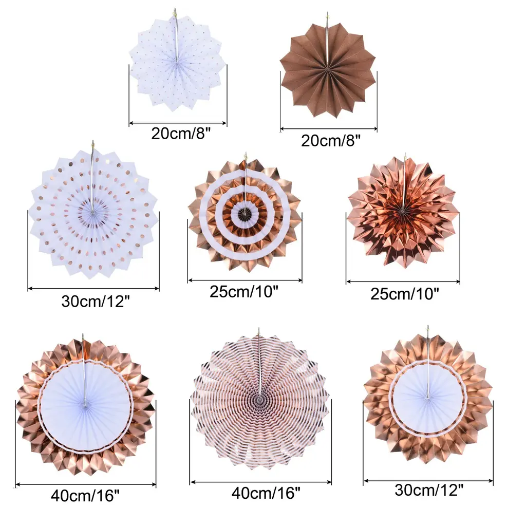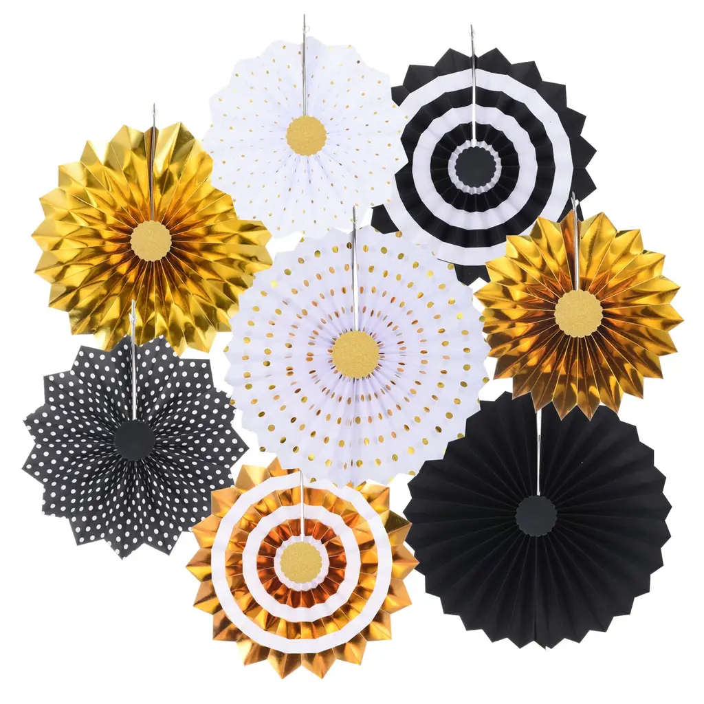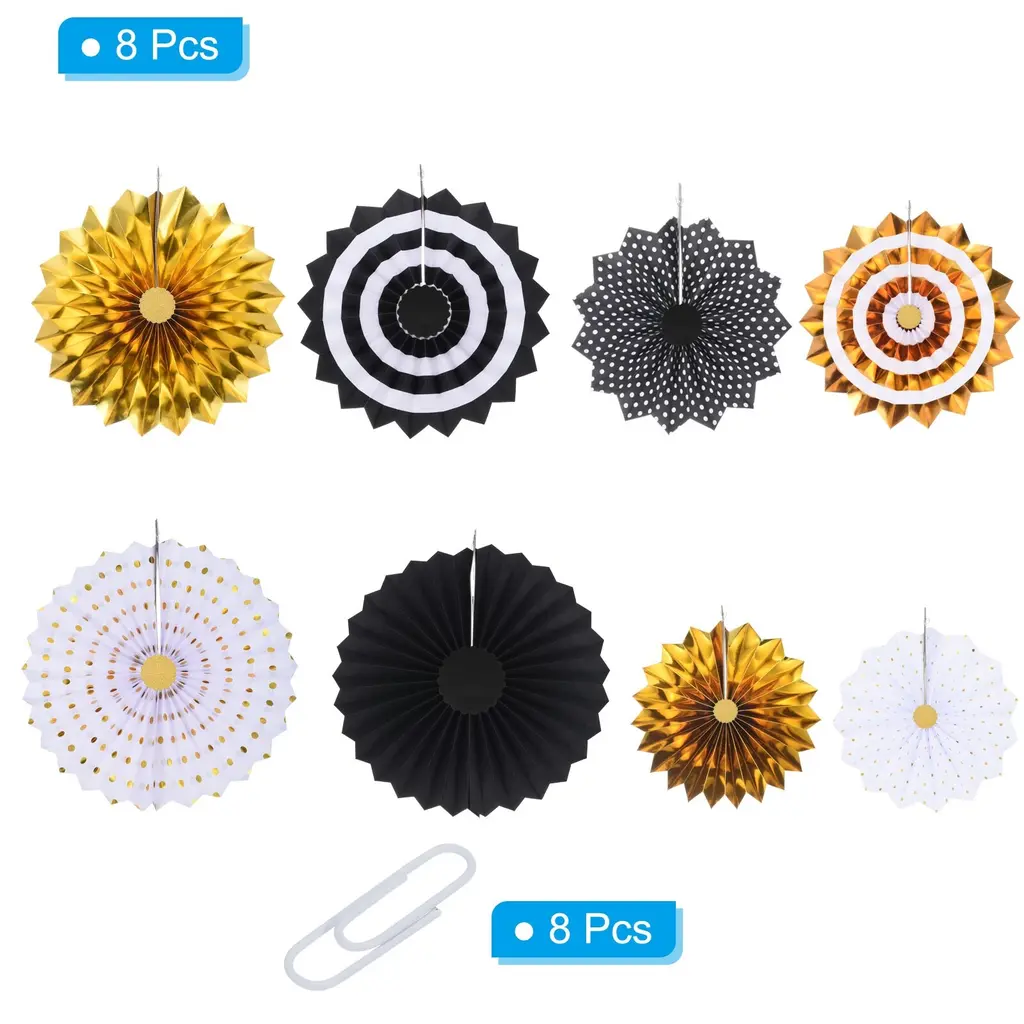 Hanging paper fan is a great addition to any space decor, perfect for weddings, birthday, graduation, festivals, party, bridal shower, special event, Valentine's day, anniversary and other occasions backdrop setting to add a romantic atmosphere.Specification Color: Black GoldenMaterial: PaperDiameter: 20cm/8", 25cm/10", 30cm/12", 40cm/16"Packing List: 1 Set (8Pcs) x Honeycomb Paper Fan (each size of 2pcs)AdvantageThese round paper fans are made of pleated sturdy paper with bright color and beautiful appearance. They are not easy to tear or lose their shape, not easy to fade and reusable.InstructionUnfold the fan, secure the ends together with pins or adhesive tape, and hang the string on the wall or anywhere you want to decorate.NOTE: Due to the difference in natural light and display resolution, the item color displayed in photos may be showing slightly different from the real object.