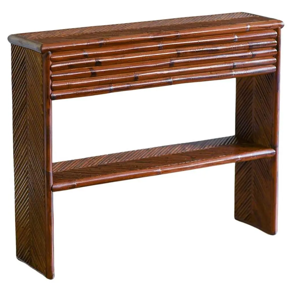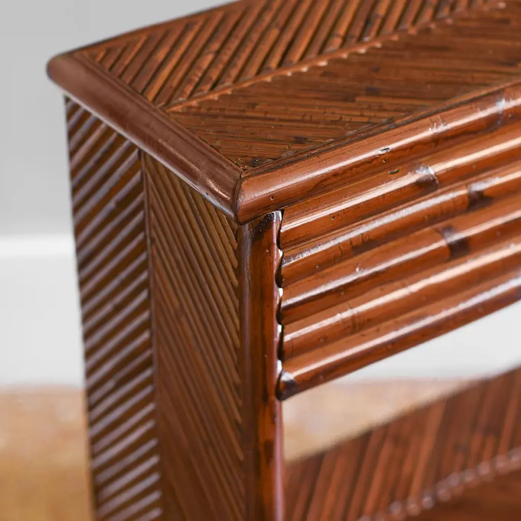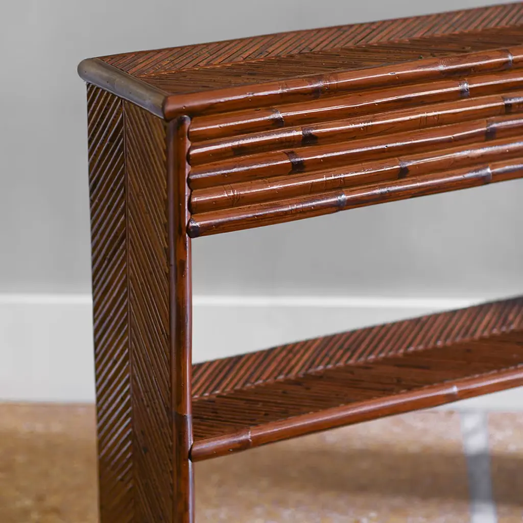 A masterful process of manual assembly followed by a careful finishing step is behind this stunning and unrepeatable cabinetmaking design. Part of an exclusive limited-edition series, the console boasts a striking level of both visual and tactile dynamism owed to a clever combination of bamboo canes, which also trace a captivating herringbone design shared by the top, sides, and single shelf.
