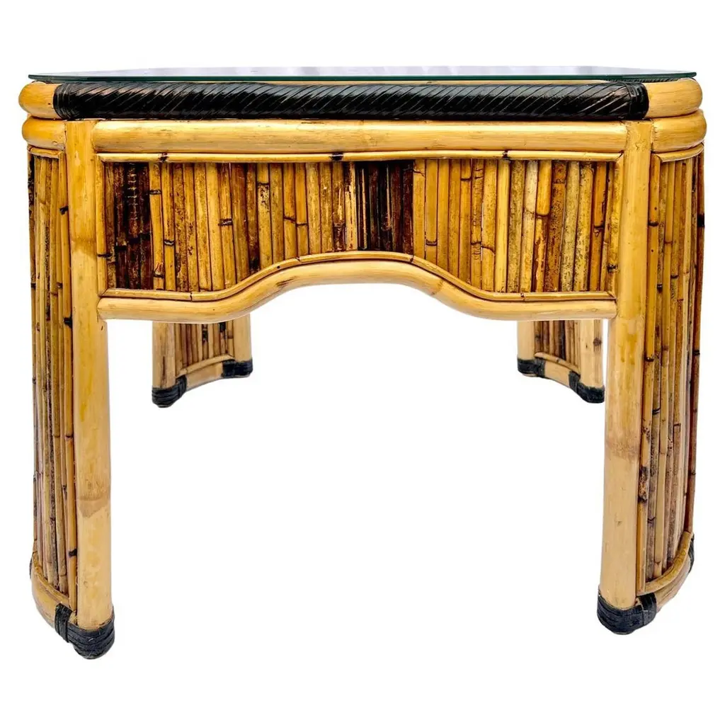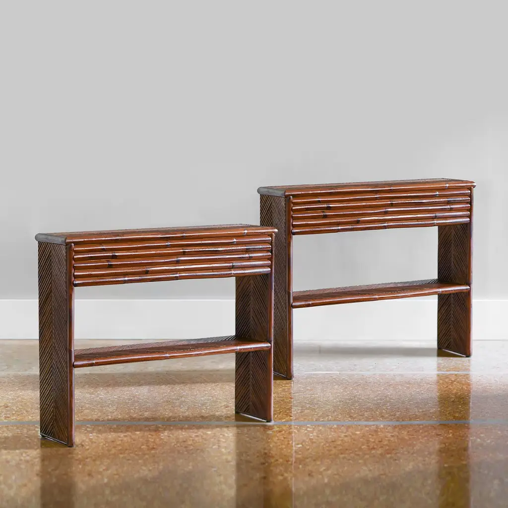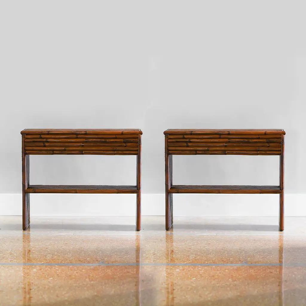 A masterful process of manual assembly followed by a careful finishing step is behind this stunning and unrepeatable cabinetmaking design. Part of an exclusive limited-edition series, the console boasts a striking level of both visual and tactile dynamism owed to a clever combination of bamboo canes, which also trace a captivating herringbone design shared by the top, sides, and single shelf.