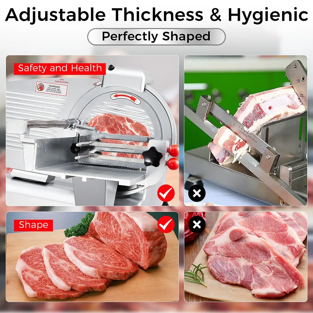 Automatic Electric Meat Slicer - This upgraded automatic electric food slicer is powered by a robust 550-watt dual motor, delivering rapid and high-yield slicing power for processing up to 660 pounds of food per hour, all while conserving electricity. It's the perfect choice for slicing turkey deli, frozen meat, and bread, and creating salad fixings!Adjustable Thickness - Offering precise food cutting, this commercial food slicer allows you to cater to various needs, such as creating thin meat slices for shabu-shabu or achieving the perfect barbecue texture for thicker meat slices. Easily adjust the slice thickness from 0 mm to 17 mm (0-0.67 inch) accurately by turning the knob with a degree scale, allowing you to achieve the specific food slice thickness you desire.Durable and Efficient Cutting - Equipped with high-quality 10-inch alloy steel blades designed to outlast standard blades, this electric meat slicer ensures rapid and efficient slicing. The sharp edge ensures swift meat slicing, while the groove cutting surface effectively prevents meat from sticking to the blade. It also features a built-in whetstone sharpener that efficiently restores sharp edges in less than a minute.Reliability & Safety - This commercial meat slicer machine incorporates multiple safety features, including a blade guard, a fully automatic meat-pushing plate, an independent blade switch, a meat-pushing plate switch, and four anti-slip bases, significantly improving operational efficiency, safety, and machine stability. The oil injection port facilitates monthly oil replenishment.Ideal for Commercial Needs and Family Gatherings - This electric meat cutter is compact and small, making it suitable for limited spaces in the home or any other location. With a wide range of applications, it can be used to cut meat, cooked food, cheese, roast beef, turkey breast, bread, vegetables, fruits, and other foods. Suitable for both home and commercial use, such as in the kitchen, home/shop/restaurant, canteen, etc.