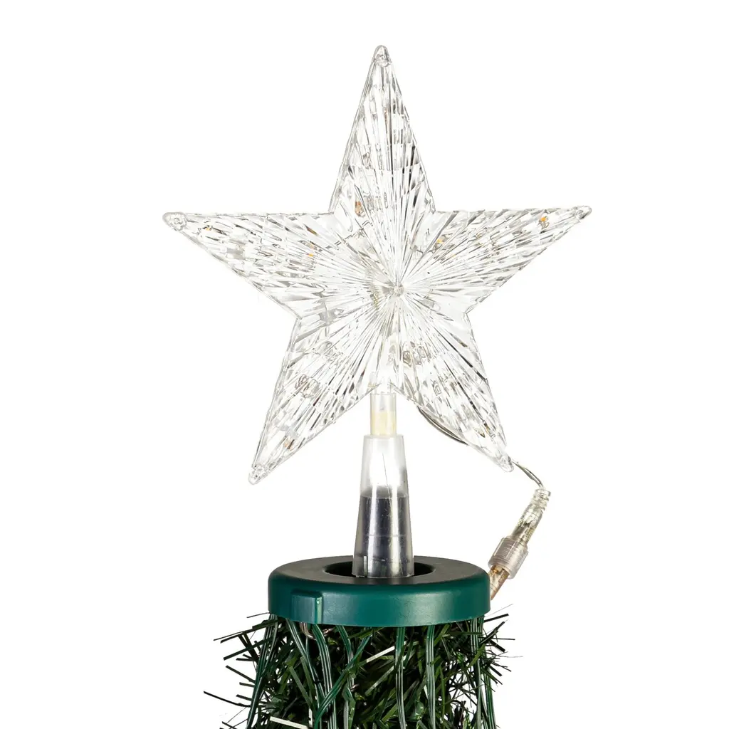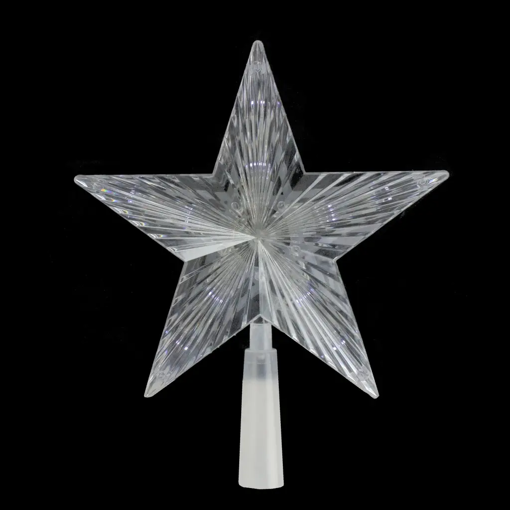 Enhance your Christmas tree with this elegant battery operated tree topper. Classic star shape adds elegance while casting a bright glow through the prismatic design. Perfect on a tree but can be used in windows or on a mantle. Product Features: Color: clear bulbs / clear wire Number of bulbs: 10 Bulb size: mini Clear lead cord Double-sided design Additional Product Features: UL listed for indoor use only If one bulb burns out the rest will stay lit Comes with replacement bulbs and cone to attach to tree Requires 2 AA batteries - not included Dimensions: 10"H x 10"W x 2"D Material(s): plastic/glass bulbs/wire