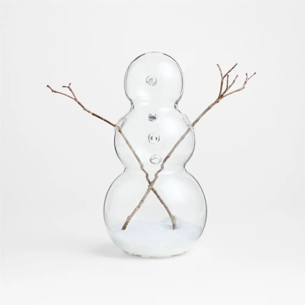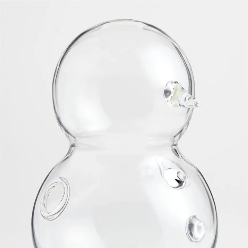 Our modern and minimalist take on a winter icon, this clear glass snowman delights with artisan quality and plenty of personality. Skilled craftspeople polish the hand-blown glass figure, adding coal-inspired buttons and a carrot-like nose by hand. Charming on its own or filled with faux snow, the small snowy friend looks particularly perfect outfitted with twig armsjust thread gathered sticks through the holes in the side of the vase.