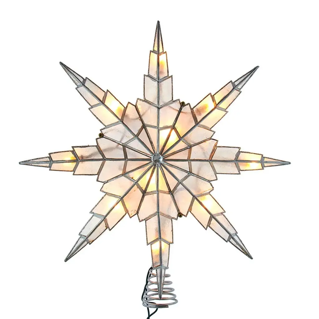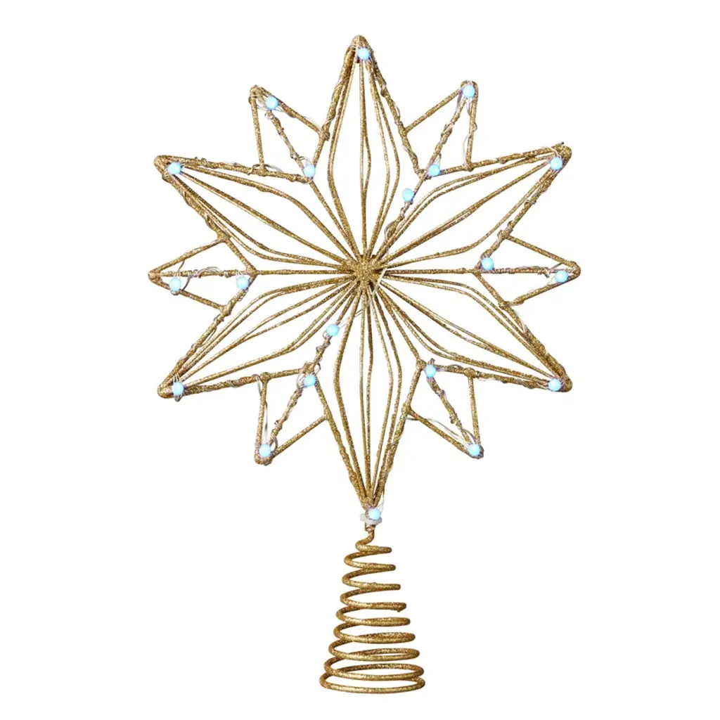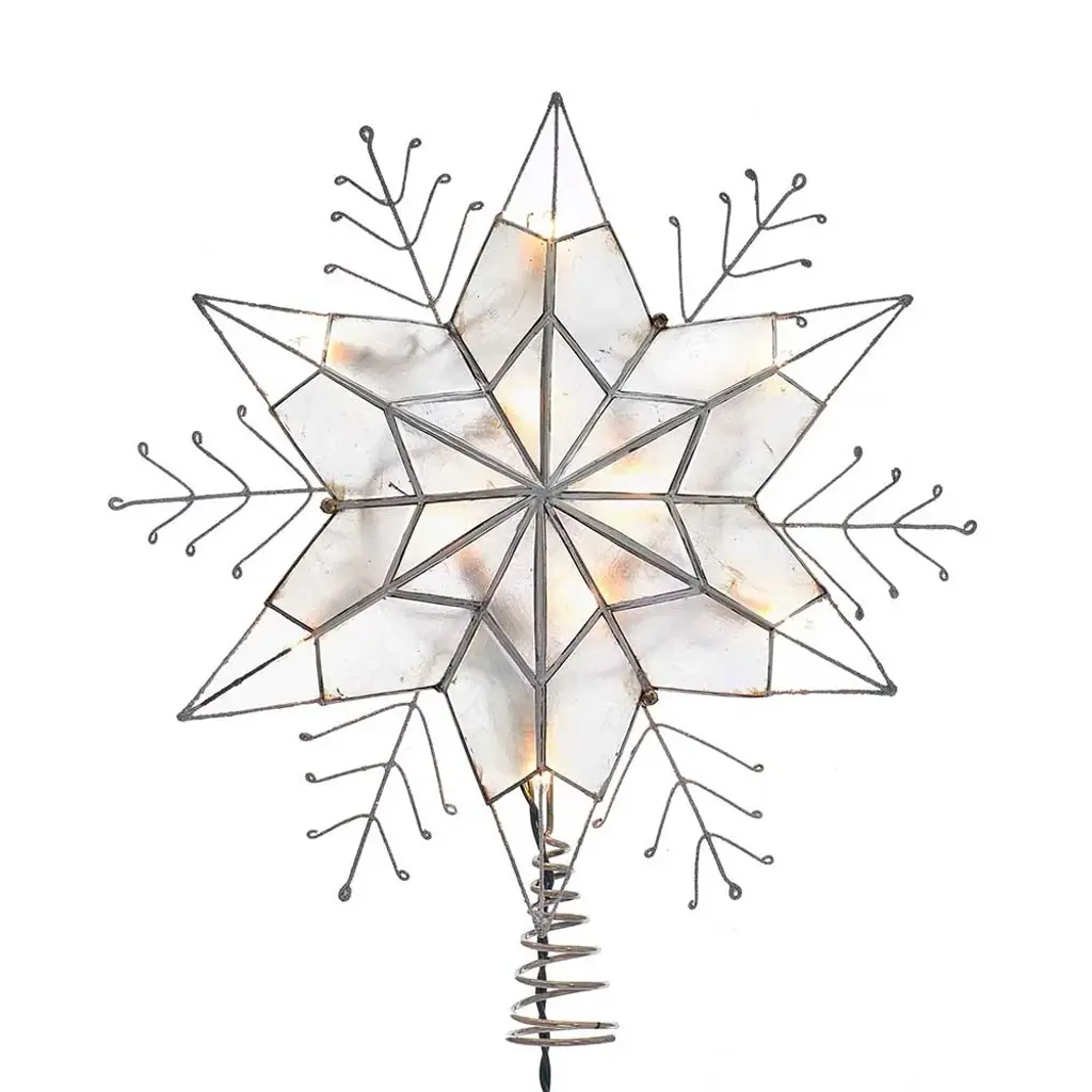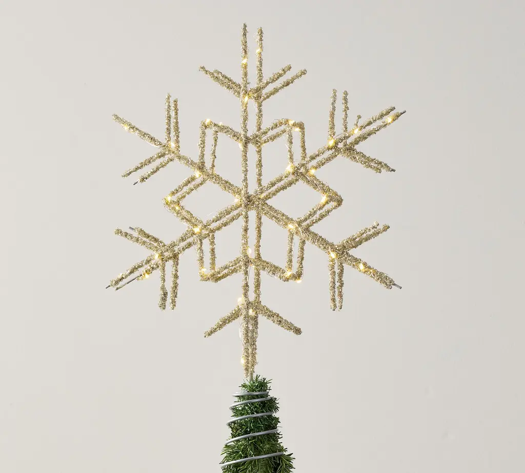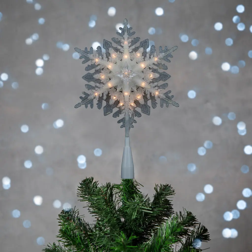 Light up your holiday decor with this gorgeous snowflake tree topper. The clear lights illuminate not only the star itself but will provide a warm rich glow over your tree. Add a bit of glamour to your interiors with this unique snowflake tree topper. Product Features: Color: pure white bulbs / white wire Number of bulbs: 20 Bulb size: mini 30" white lead cord Single-sided design Additional Product Features: Super bright bulbs UL certified and approved for indoor use only Comes with replacement bulbs spare fuse and cone to attach to tree Contains 1 plug with end connector which allows you to stack multiple lighted items together (not to exceed 210 watts) Wire gauge: 22 120 volts 60 hertz .06 amps 7.2 watts Dimensions: Snowflake: 10"H x 9"W x 2.5"D Cone: 3.5" high x 1" diameter (approximaely) Material(s): plastic/glass bulbs/wire
