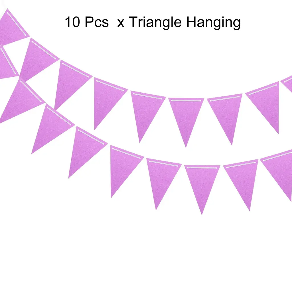 What is this?This pennant banner is mainly used for party decoration, you can hang or stick these decorative ribbons on the wall, window, door or shelf to add a different atmosphere to your party, mainly used for birthdays, weddings, Christmas, Easter, masquerade, graduation party and other partiesWhat will I get?Material: PaperColor: Dark PurpleFlag Quantity:15Hanging Length: 6m/19.69 FeetTriangle size:13*18cm / 5.12 x 7.09 inch(W*L)Package content:10 Pcs x Triangle HangingIs there any advantage of the product?1. This pennant banner flag is made of paper, not easy to bend and break, and can be repeated. After the party is over,just take it off and fold it back.2. Pennant banner flags string has solid color, you can DIY draw any pattern you want on the banner, adding a variety of decorations to your party.3. These triangle bunting flags are very easy to use, strong rope, so that you will not fall off easily even if you hang it outdoors, you can hang it on any decorative place you wantHow to use it?Unfold the triangle bunting flags , and then tie the ropes at both ends to a fixed positionWhat should I notice?Tips: please confirm the length before you buy.
