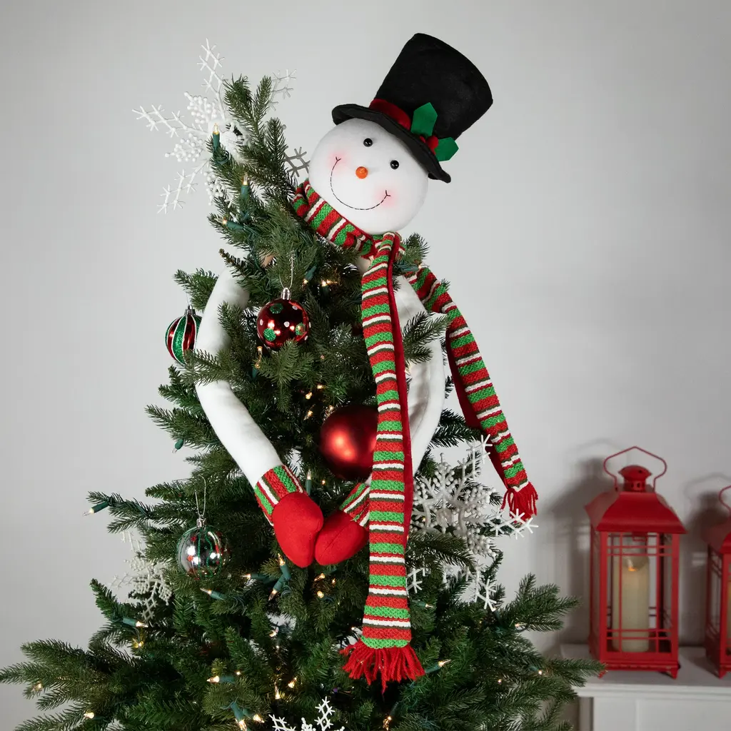 This charming tree topper brings the spirit of the Christmas season to life. What sets this tree topper apart is its design allowing you to position the snowman's arms to hug the tree. The head is hollow allowing a snug fit to the tree. With the snowman depicted in a classic black top hat and and colorful striped scarf this tree topper is sure to be an admired part of the holidays for years to come. Features: Plush snowman tree topper Orange carrot nose and striped scarf Snowman's arms hug the tree with hook and loop tape For indoor use only Overall dimensions: 30" high x 45" wide Snowman: 10" high x 5.5" wide Material(s): fabric/plastic