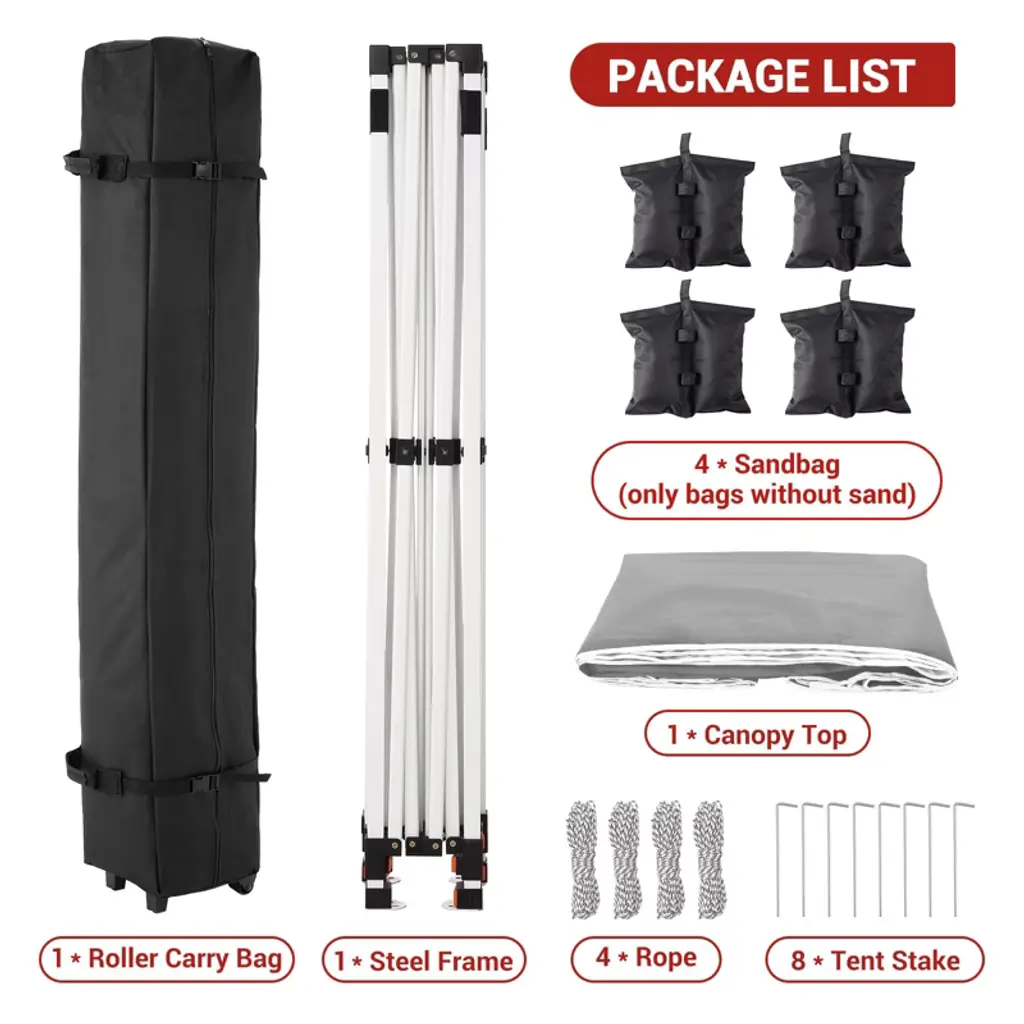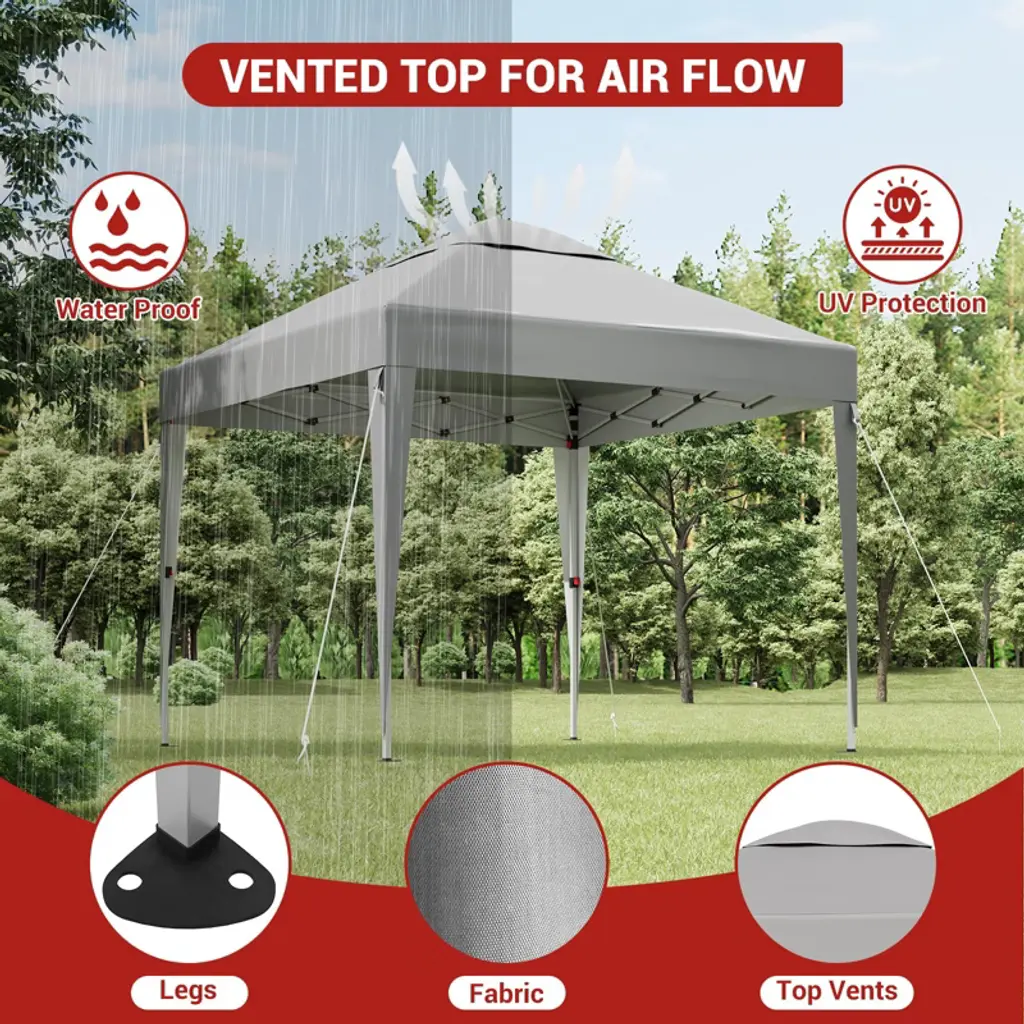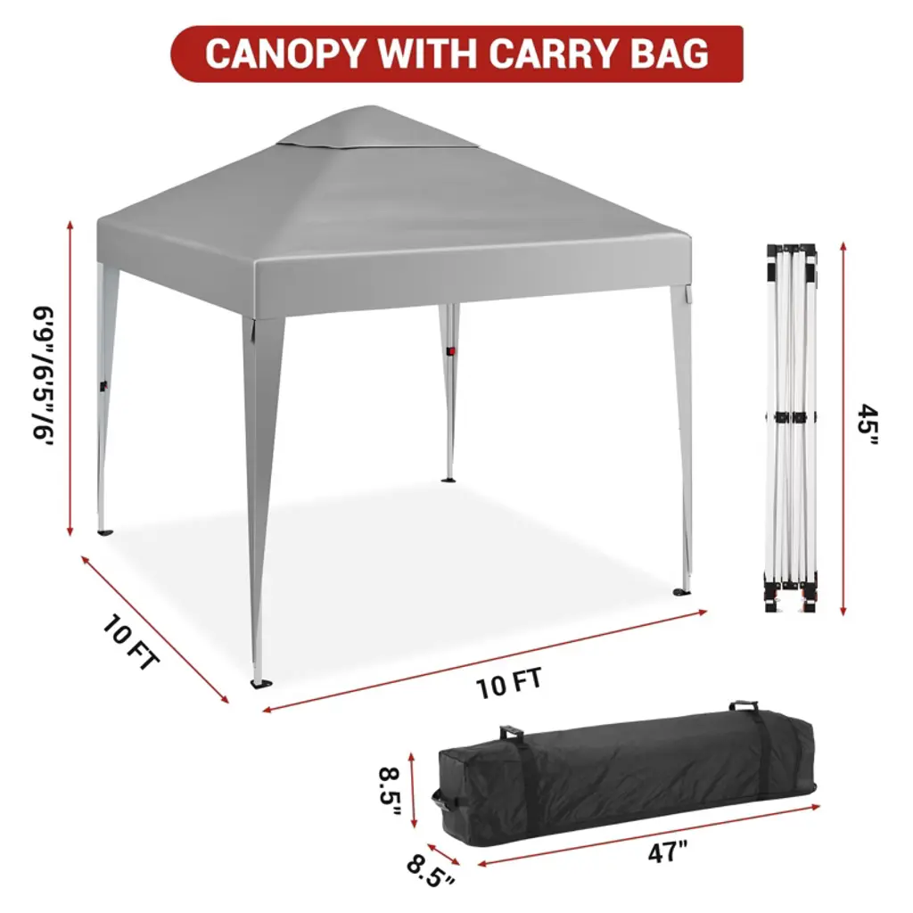 Generous Shade CoverageThis commercial-grade canopy provides 100 sq ft of shade, comfortably accommodating 6-8 people for outdoor gatherings. Features: Three adjustable height settings (up to 6.75 ft) Vented roof design improves airflow while blocking sunlight Versatile use for patios, gardens, camping, and events All-Weather ProtectionConstructed with: 210D silver-coated Oxford fabric (UPF 50+ sun protection) Waterproof PU coating for rain resistance Reinforced stitching at stress points Heavy-Duty Frame & Stability Powder-coated steel frame resists rust and corrosion Includes 8 ground stakes + 4 guy ropes for wind resistance 4 sandbag pockets (sandbags included) for added weight Industrial-grade connectors for structural integrity Convenient Features Tool-free instant setup (under 2 minutes) Compact wheeled carry bag (48" long when packed) Removable tarp for easy cleaning/replacement Wall-compatible design (walls sold separately) Technical Specifications Frame Material: 1-inch powder-coated steel Fabric: 210D Oxford with 300mm PU coating Weight Capacity: Withstands 15+ mph winds when anchored Packaged Weight: [Insert] lbs Ideal For: Backyard BBQs & parties Farmers markets & vendor booths Beach/park outings Sporting events & tailgates Emergency shade shelters This professional-grade pop-up canopy combines superior weather protection with remarkable portability, offering reliable shade wherever your outdoor adventures take you. The vented roof and adjustable heights make it adaptable for various activities while the wheeled bag ensures easy transport.