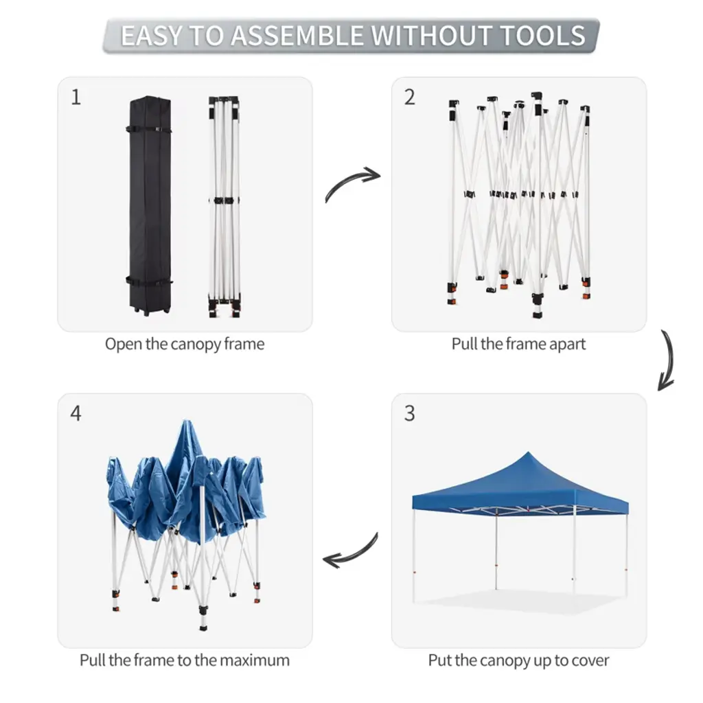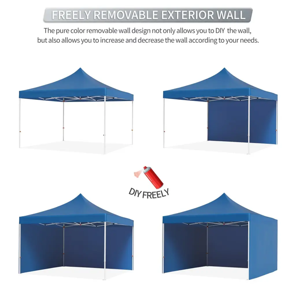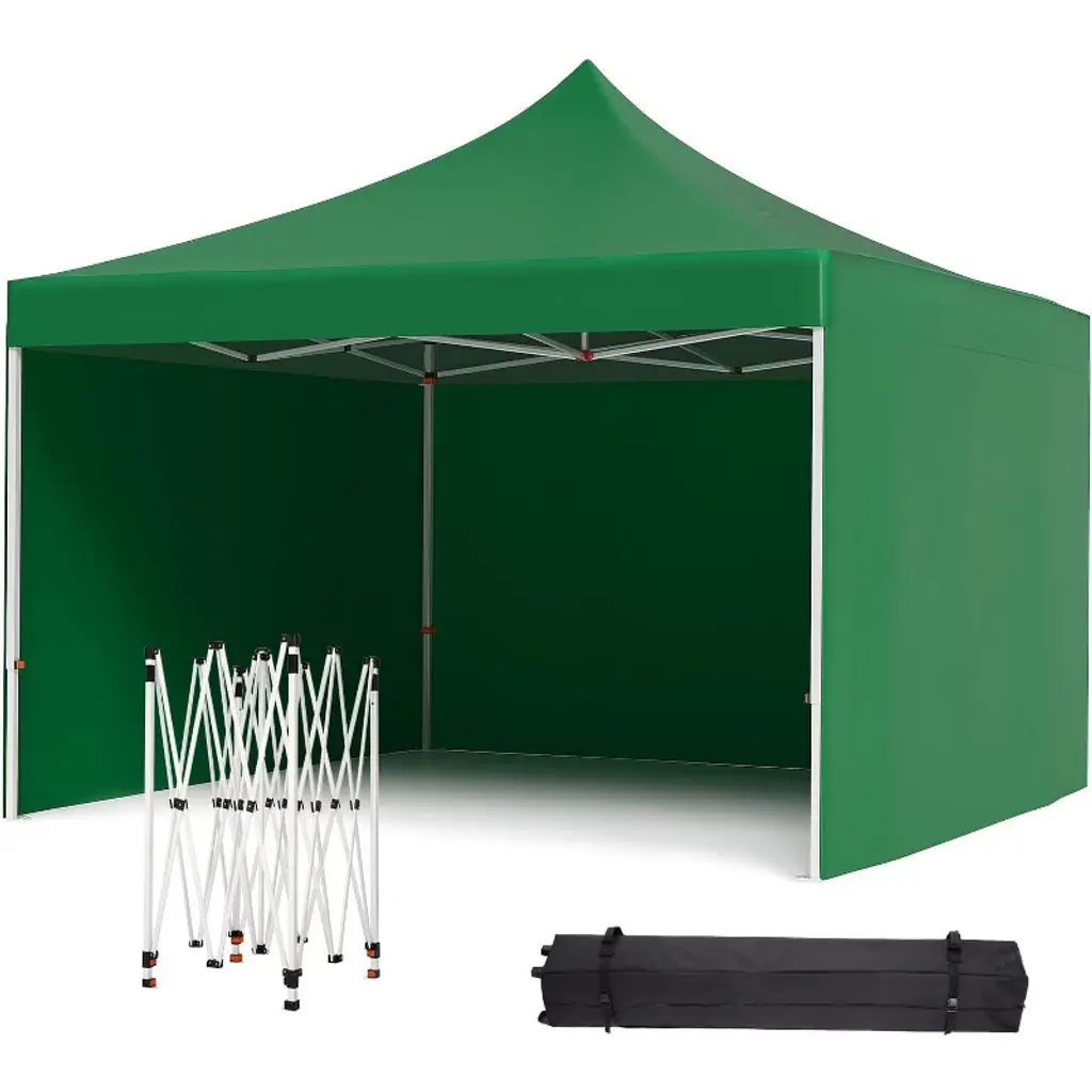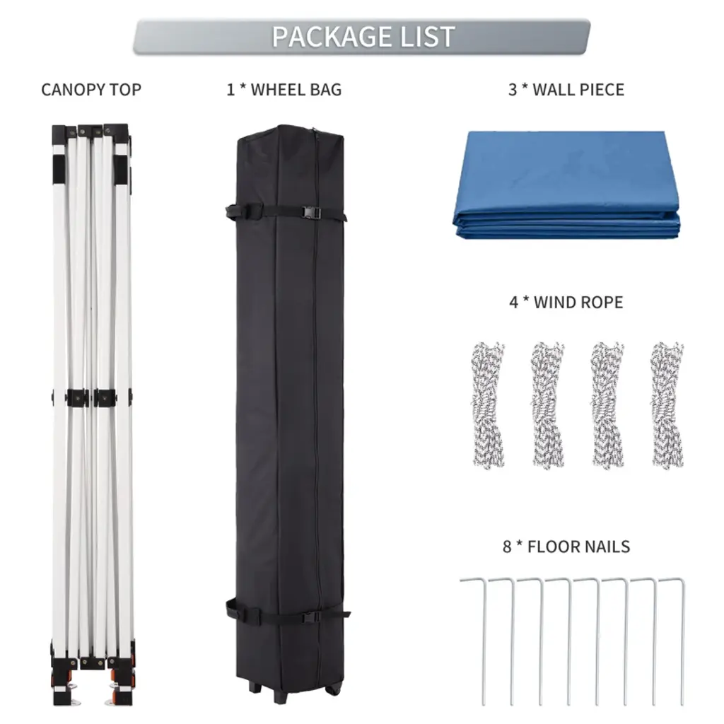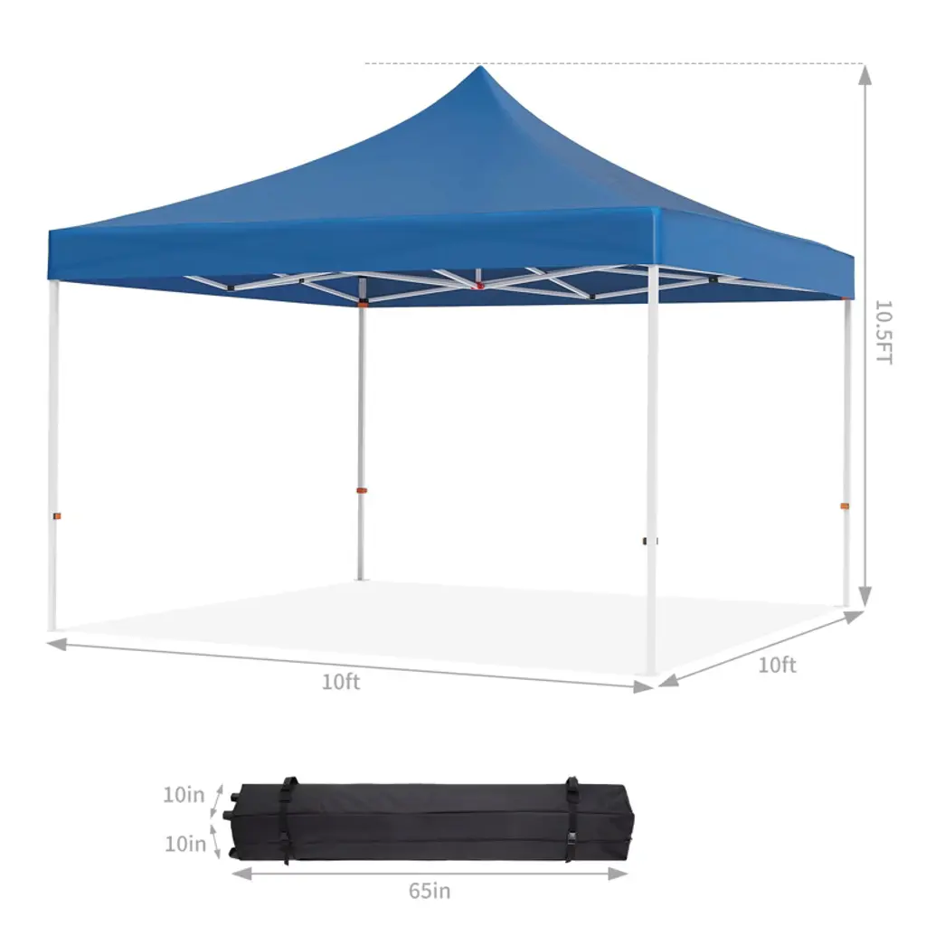 Instant Outdoor Shelter for Events & GatheringsThis heavy-duty instant canopy delivers 100 sq ft of premium shade with professional-grade durability, perfect for backyard parties, vendor markets, and beach outings. The 420D PU-coated fabric provides UPF 50+ sun protection and water resistance, while the reinforced steel frame ensures stability in windy conditions.Key Features1. 100 sq ft Coverage ¨C Fits 8-10 people with tables/chairs2. Military-Grade Fabric ¨C 420D PU top + 150D Oxford sidewalls (99% UV block)3. 3 Removable Sidewalls ¨C Customize shade/privacy as needed4. One-Touch Setup ¨C Pops up in minutes with pre-attached frame5. All-Terrain Stability ¨C Includes 8 ground stakes & wind ropes6. Commercial Wheeled Bag ¨C Heavy-duty 600D Oxford with telescopic handleTechnical Specifications Frame: 1.25" powder-coated steel (rust-proof) Fabric: 420D PU (1500mm waterproof rating) Peak Height: 9.5' (adjustable legs) Wind Resistance: 25+ mph (when properly anchored) Included: 3 sidewalls, wheeled case, full anchoring kit Why This Canopy Stands Out? Thicker Fabric ¨C Outlasts standard 200D canopies? Faster Assembly ¨C Pre-connected frame locks in place? True All-Weather Use ¨C Handles sun, rain, and moderate wind? Pro Transport ¨C Wheeled bag glides over sand/grassIdeal for caterers, craft fairs, and outdoor entertaining, this versatile shelter combines event-ready performance with easy portability. The detachable sidewalls allow quick conversion from open-air shade to semi-enclosed space for changing rooms or storage.