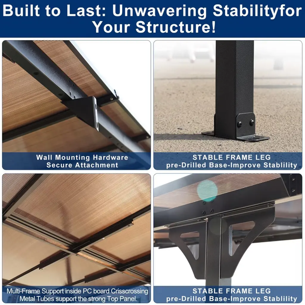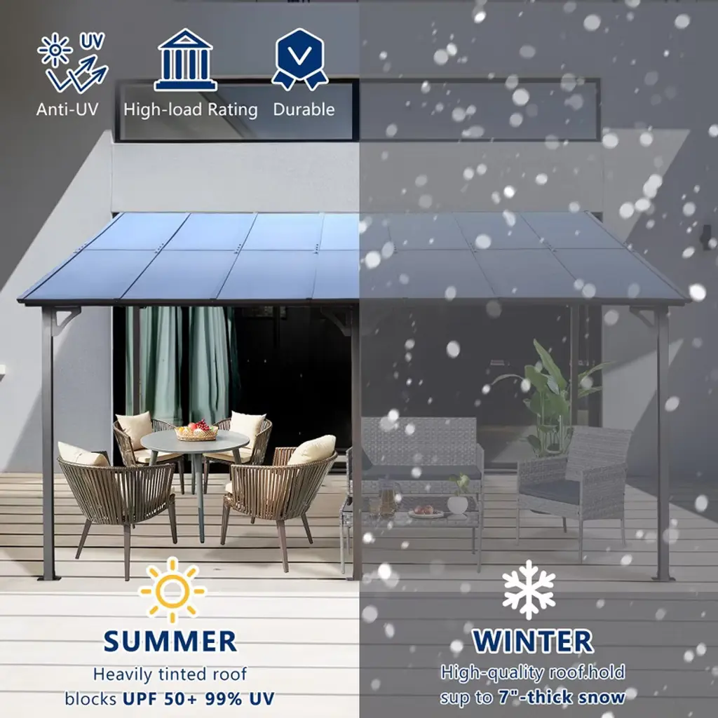 【Remarkable Load-bearing】with the impressive static pressure and great load-bearing of 60lbs/m2,you can rest easy knowing that the gazebo can handle heavy snow and challenging weather conditions.You have to fasten it securely on the wall and ground so it can better work. The wind resistance level is 30-35mph and the snow carrying depth is 4 inch respectively. 【Flexible Panels】Outperforming fragile hardtop panels, Made by durable polycarbonate hollow sheet.The incorporation of flexible panels effectively disperses impact and mitigates the pressure exerted on the roof by severe weather event the tilted design ensures complete water resistance throughout our extensive 6-month outdoor testing. 【Usage Guidelines】To ensure maximum stability, it is recommended that you mount the gazebo against a wall using the included nails. The pergola is perfect for use near a pool, hot tub, for outdoor dining, or as an entertainment space. 【Sturdy Construction】This Wall-Mounted Lean to Awning is made of powder-coated steel frame for rusting and chipping prevention. The bottom of four square legs are thicker and reinforced to provide a stable and strong support. 【Assembly & Nntice】Following the installation manual, it' s better to ask 3-4 persons to help set up this pergola, and it may take 1.5-2 hours to finish assembling. 2 parcels will shipped of the gazebo,which may arrive at different times.Rest assured, we will promptly follow up on this matter.