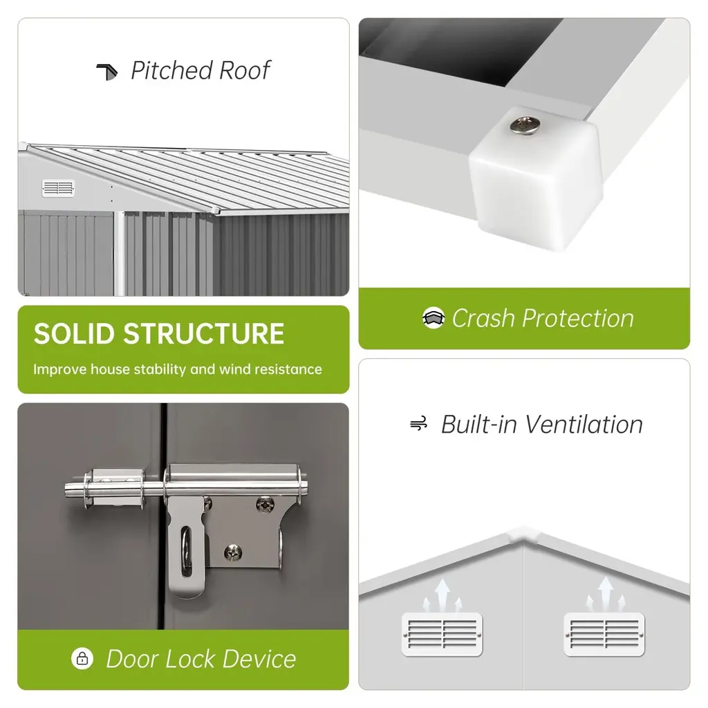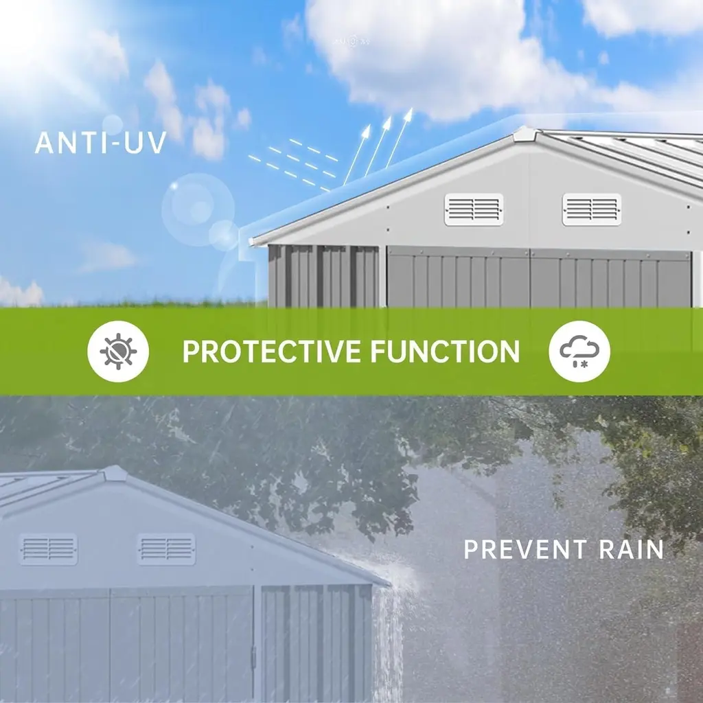 【Outdoor Storage Shed】: This 10 X 8 FT garden storage shed is perfect for maximizing storage in a smaller space. Measures L 8.69' x W 10.43' x H 6.66' and door measures L 4.97' x H 5.40'. Not only can you use it as a storage room to store your tools, but also as a garbage collection room to keep your backyard clean and tidy. 【Sturdy & Durable】: The shed is made of high quality galvanized steel and frame with advanced corrosion resistance. Two sturdy lockable doors (locks not included) securely protect your personal belongings from accidental intrusion by strangers or small animals. 【Ventilated Sloped Roof Design】: The sloped roof design allows for quick drainage, prevents rainwater from collecting and rusting, and protects your stored items from mold and . Ventilation openings circulate air inside the room, allowing wood and iron items to be stored and kept dry. 【Easy to Assemble】: The shed comes out of the box ready to assemble, no cutting or drilling required. All parts of the metal outdoor storage shed are pre-cut, pre-drilled and labeled with marking numbers. It is recommended to assemble it on a flat surface, do not tighten all screws during assembly until the whole project is completed. 【Multifunctional Use】: Can store snow blowers, lawn mowers, shovels, outdoor chairs, bikes and toy cars. We that having such a backyard outdoor storage is a perfect decision for you.