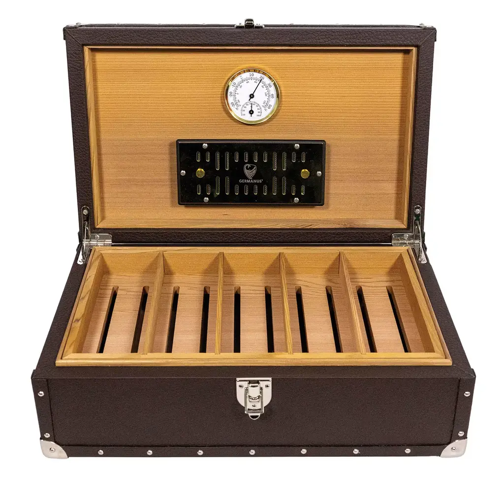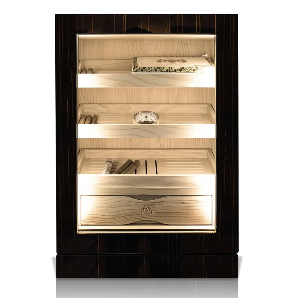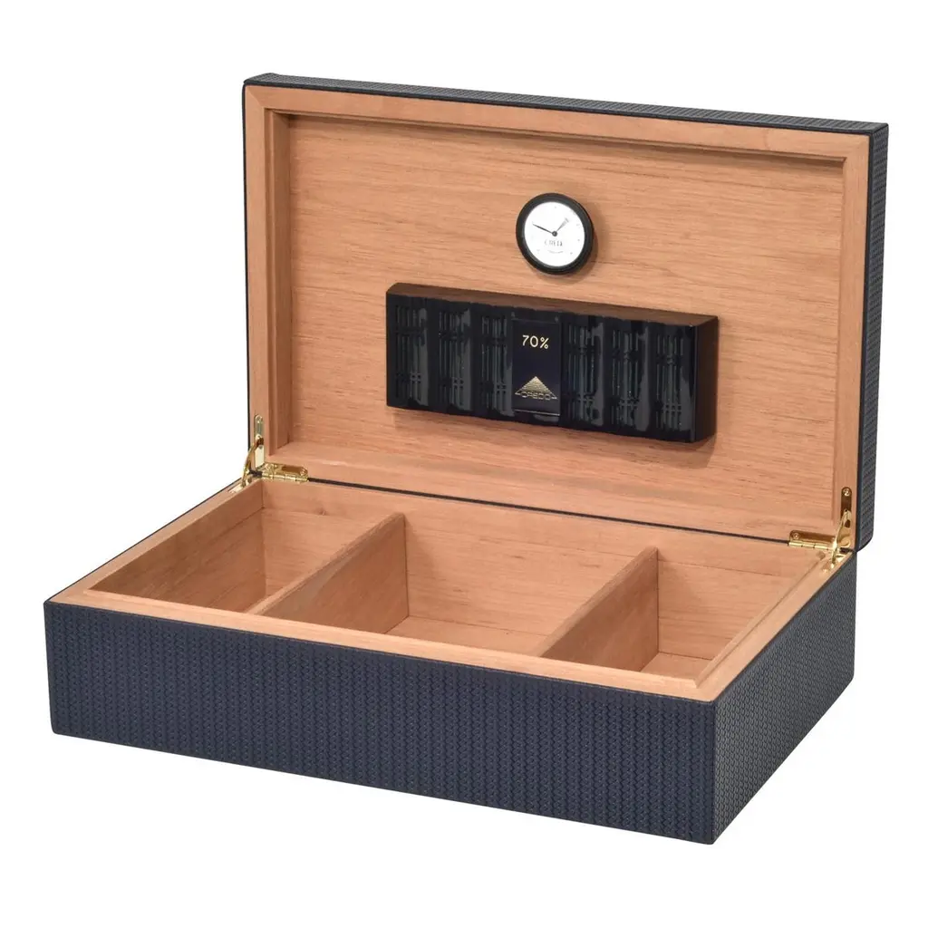 A striking addition to a personal collection or a superb gift for a cigar aficionado, this humidor box was crafted entirely of prized Spanish cedar and can be used to store up to 100 cigars, thanks to its generous interior, divided into three practical compartments. The humidor is equipped with a humidified and an hygrometer. The exterior is equipped in elegant black leather with a smooth finish. Both color and finish of the exterior can be chosen among the ones available in the collection.